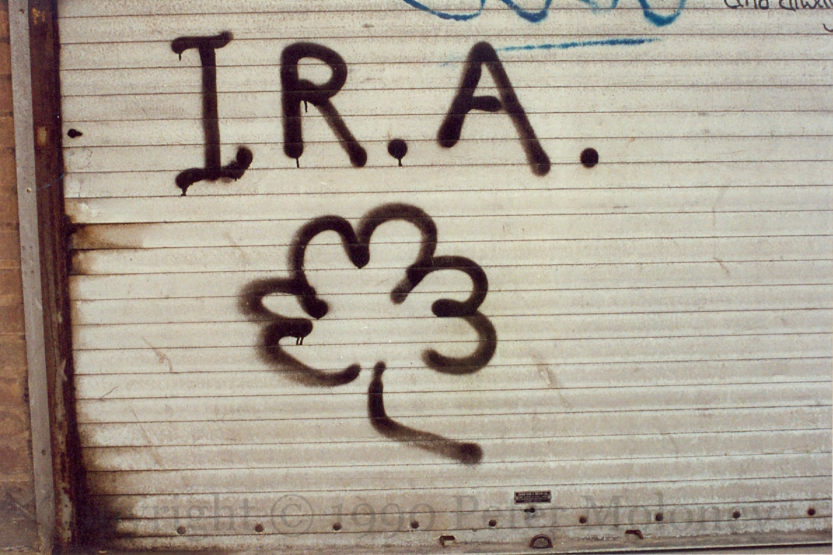 IRA Shamrock 1990-04-262025-02-08Extramural Activity “IRA” with a shamrock. Falls Road, Belfast. Click image to enlargeCopyright © 1990 Peter MoloneyM02512 Share this: Share on X (Opens in new window) X Share on Facebook (Opens in new window) Facebook Like Loading... Related
