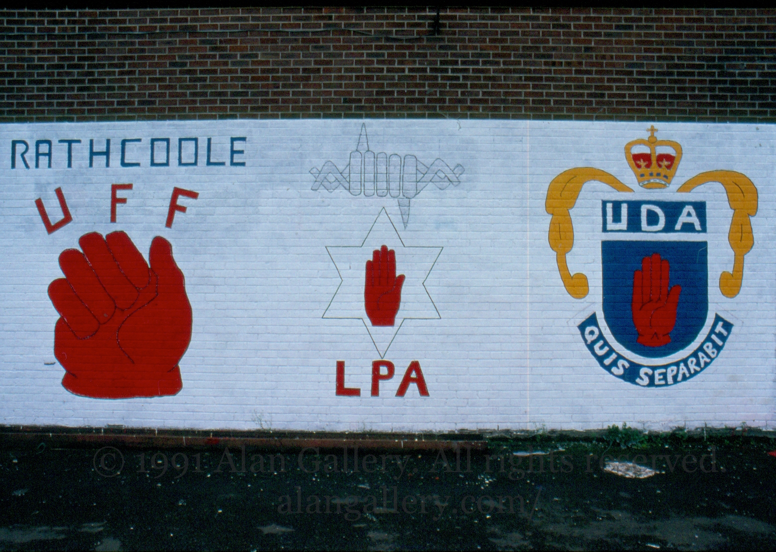 Rathcoole UFF LPA UDA 1991-01-012025-02-08Extramural Activity UDA/UFF mural in Rathcoole, with barbed wire for the Loyalist Prisoners Association. Click image to enlargeCopyright © 1991 Alan Gallery. All rights reserved. alangallery.comM00948 Share this: Click to share on X (Opens in new window) X Click to share on Facebook (Opens in new window) Facebook Like Loading... Related
