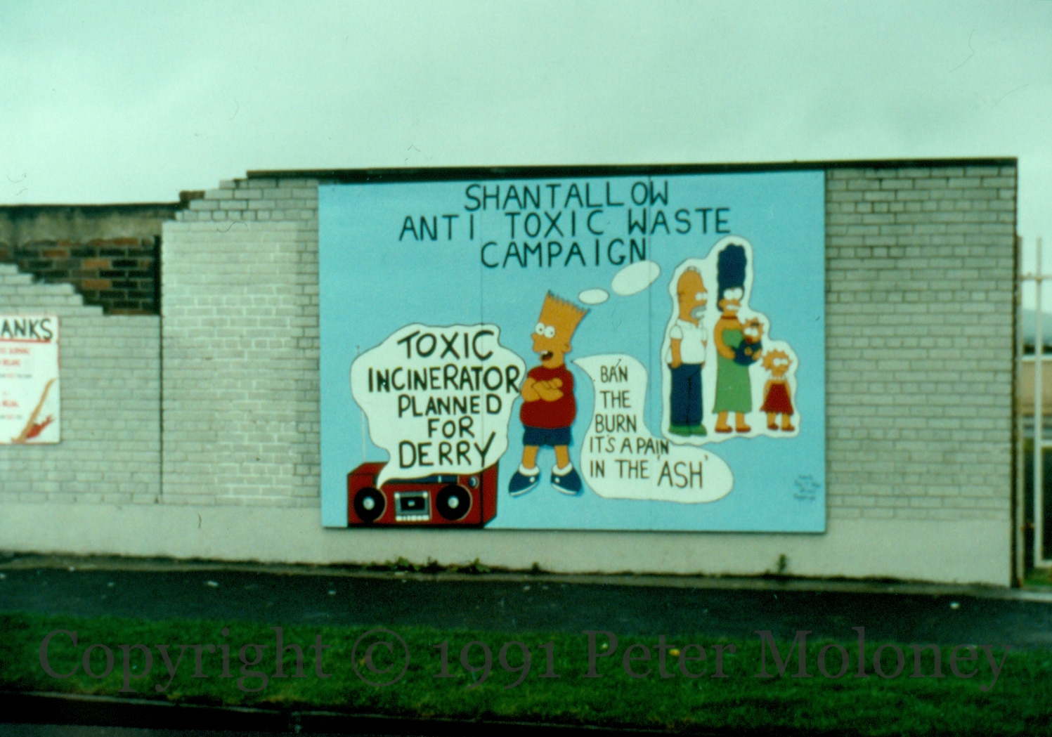 The Simpsons moved to prime-time from The Tracey Ullman Show and became a hit for Fox beginning in December 1989. By 1991, the family, and especially Bart Simpson, were famous enough to be used in the “Shantallow anti toxic waste campaign” against a DuPont “Toxic incinerator planned for Derry”: “Ban the burn – it’s a pain in the ash.” For a history of the campaign, see “A Burning Issue?” p. 7 ff.