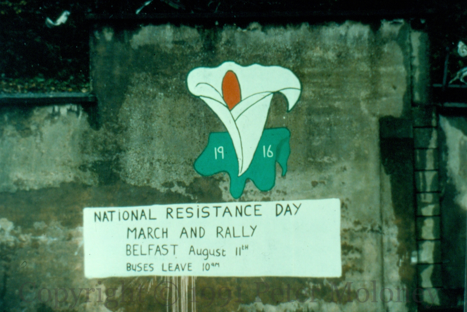 National Resistance Day 1991-01-192025-02-08Extramural Activity A 1916 Easter Rising lily in Lecky Road, Derry, calling for participation in a Belfast march and rally for ‘national resistance’ on August 11th. “Buses leave 10 am.” Lecky Road, Derry. Click image to enlargeCopyright © 1991 Peter MoloneyM00980 Share this: Share on X (Opens in new window) X Share on Facebook (Opens in new window) Facebook Like Loading... Related