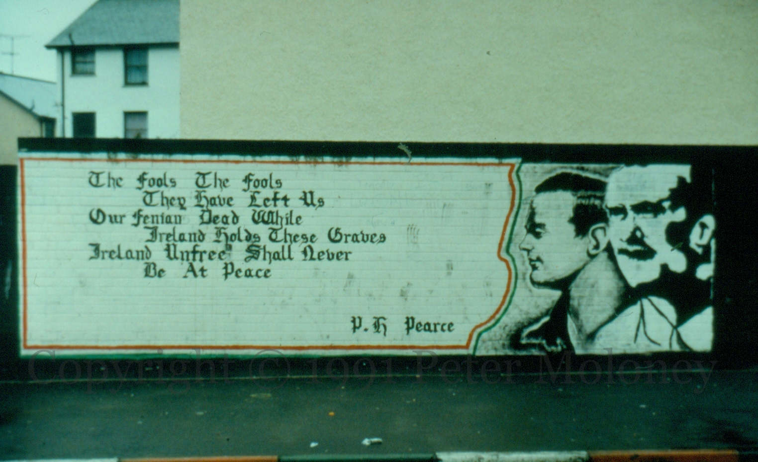 “The fools, the fools, they have left us our Fenian dead. While Ireland holds these graves, Ireland unfree shall never be at peace.” Attributed to “P. H. Pearce”. Portraits of Pearse and Connolly appear to the right.