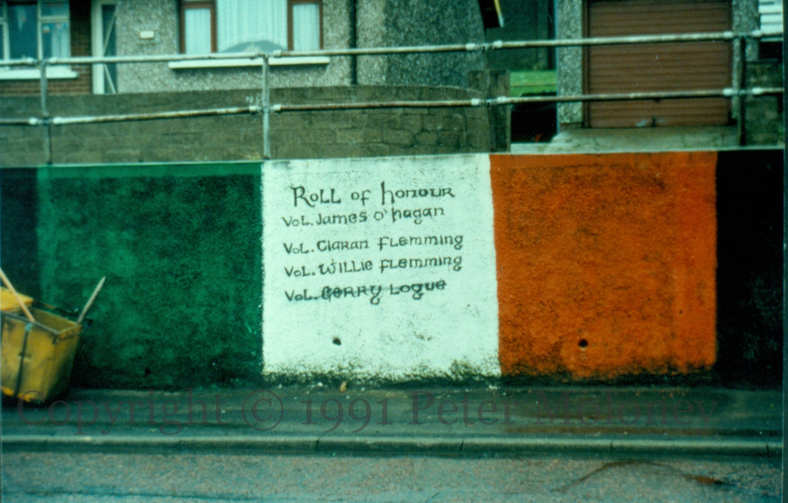 Roll Of Honour 1991-01-252025-02-08Extramural Activity A short IRA roll of honour on Strabane Old Road, Gobnascale, Derry: James O’Hagan, Ciaran Fleming/Flemming, Willie Fleming/Flemming, and (scored out?) Gerry Logue. Click image to enlargeCopyright © 1991 Peter MoloneyM00987 Share this: Click to share on X (Opens in new window) X Click to share on Facebook (Opens in new window) Facebook Like Loading... Related
