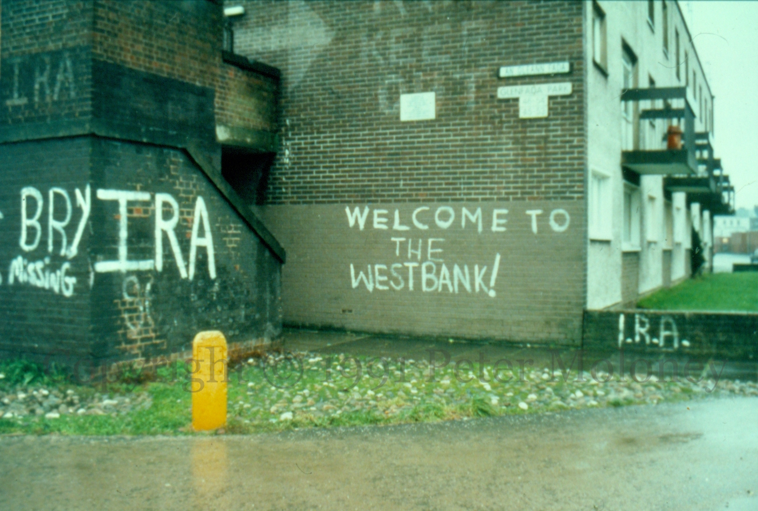 A reference to one of the Israeli-occupied territories. With “IRA” and “BRY” (Bogside Republican Youth) graffiti. The plaque in the centre is the memorial to Charles Love.