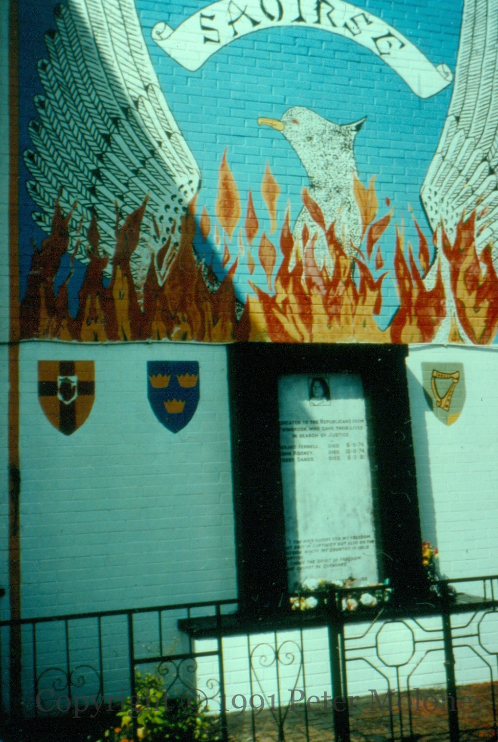 Memorial to Bobby Sands, with phoenix above (painted by Mo Chara Kelly) in Jasmine Way/Juniper Park, Twinbrook, next to Sands’s home. Two volunteers in reflective pose would later be added by local youths.
