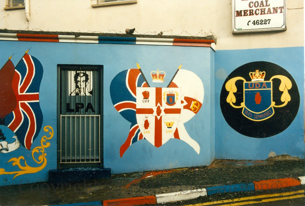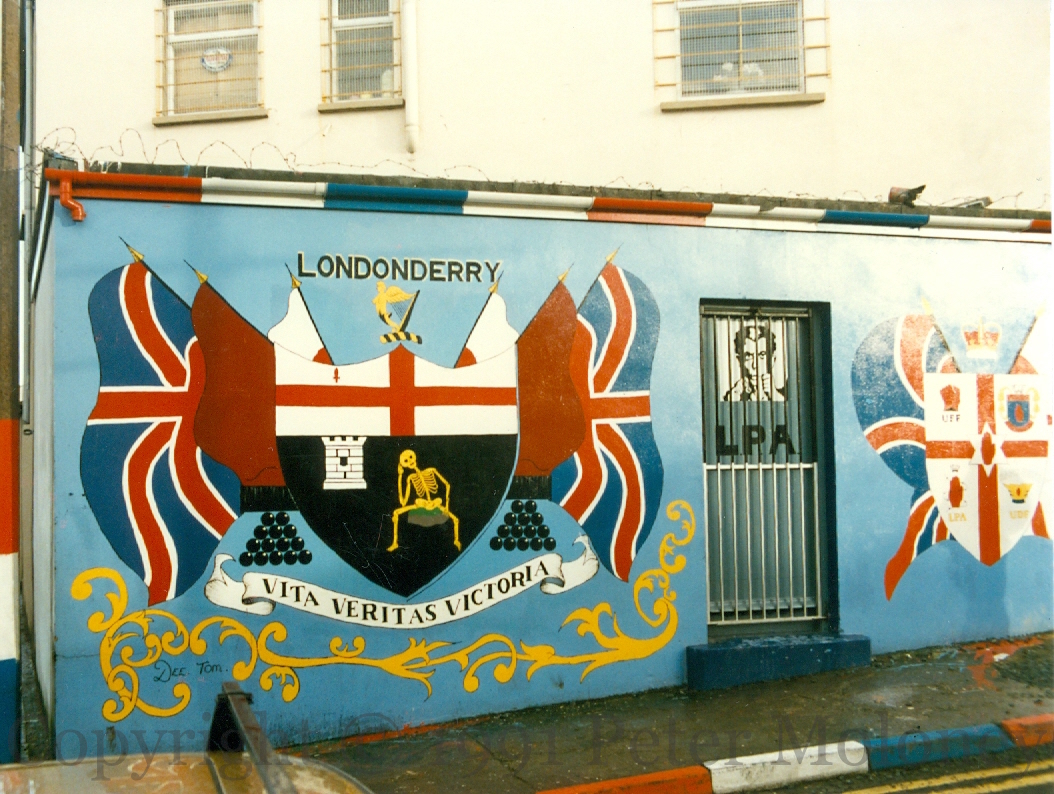 Two images from 1991 of the Londonderry, UDF, and UDA insignia in Bond’s Place, Derry. The LPA prisoner behind the bars of the gate is new. See previously 1990’s Vita Veritas Victoria and an earlier version with King Billy from 1985.
