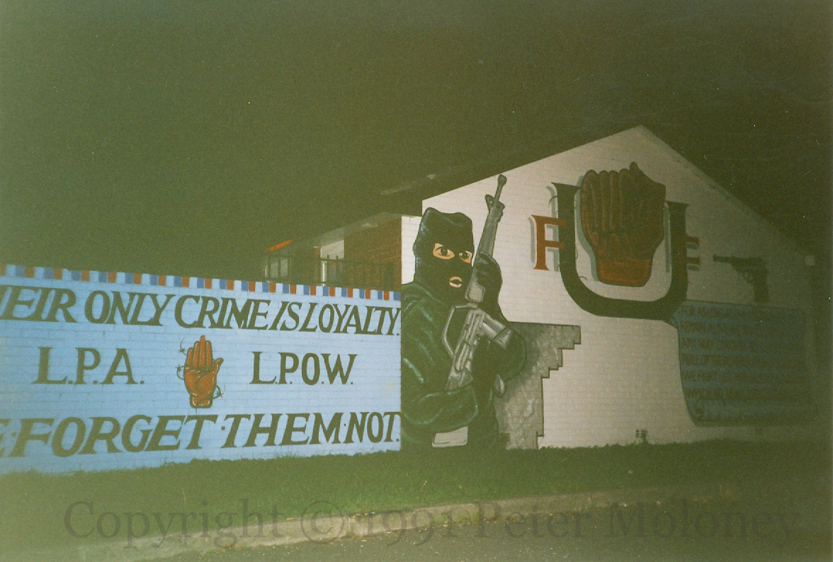 UFF and LPA/LPOW mural on Newtownards Road with masked volunteer and rifle, with the “U” in barbed wire. (The words “East Belfast Brigade” would later be added in the middle.) With a quote modelled on the Declaration of Arbroath: “For as long as one hundred of us remain alive we shall never in any way consent to submit to the rule of the Irish, for it is not for glory we fight but for freedom alone which no man loses but with his life.” (Originally, “for, as long as but a hundred of us remain alive, never will we on any conditions be brought under English rule. It is in truth not for glory, nor riches, nor honours that we are fighting, but for freedom – for that alone, which no honest man gives up but with life itself.”)