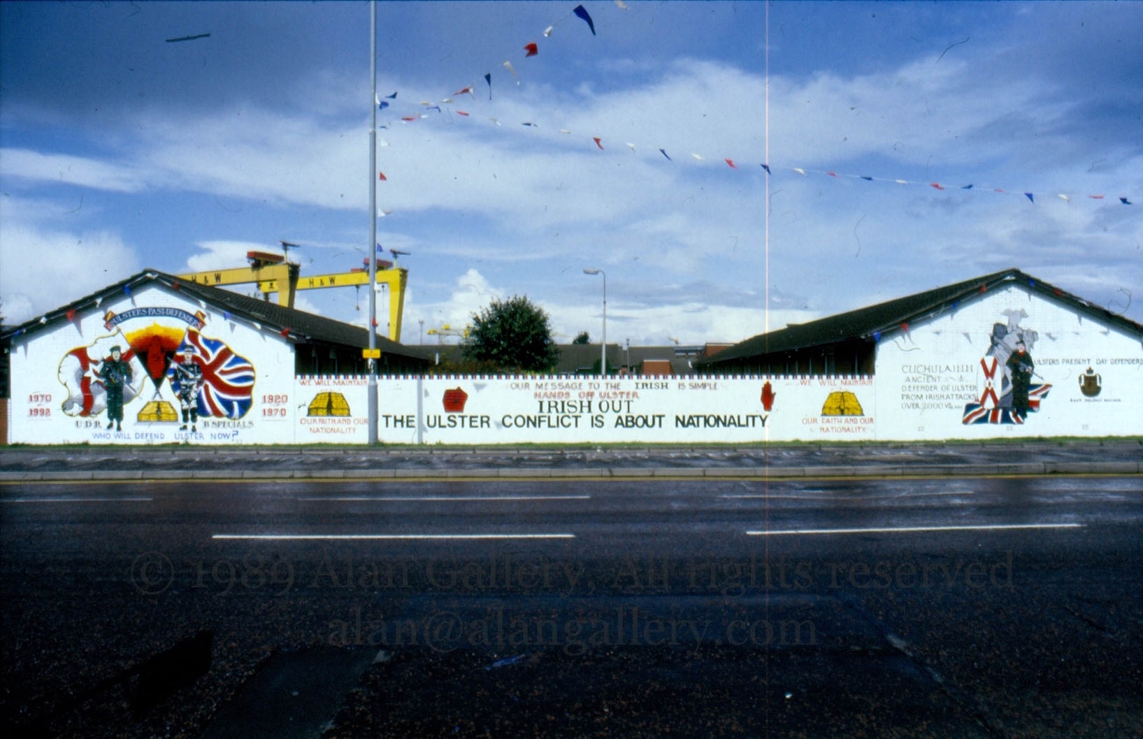 Wide shot showing the low wall between the two “Ulster’s defenders” murals: “Our message to the Irish is simple: Hands off Ulster; Irish out; The Ulster conflict is about nationality”, and “We will maintain our faith and our nationality” above images of the Bible. Newtownards Road, Belfast.