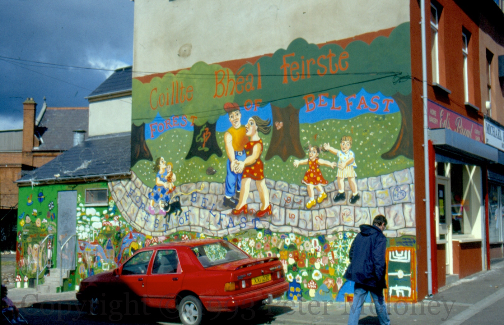 In 1992, the Forest Of Belfast project was started, a public-private to preserve old trees and encourage tree-planting. Above is one of the murals painted to publicise the effort. (Another was – and remains to this day (2017) – on Hillman Street/Antrim Road.)