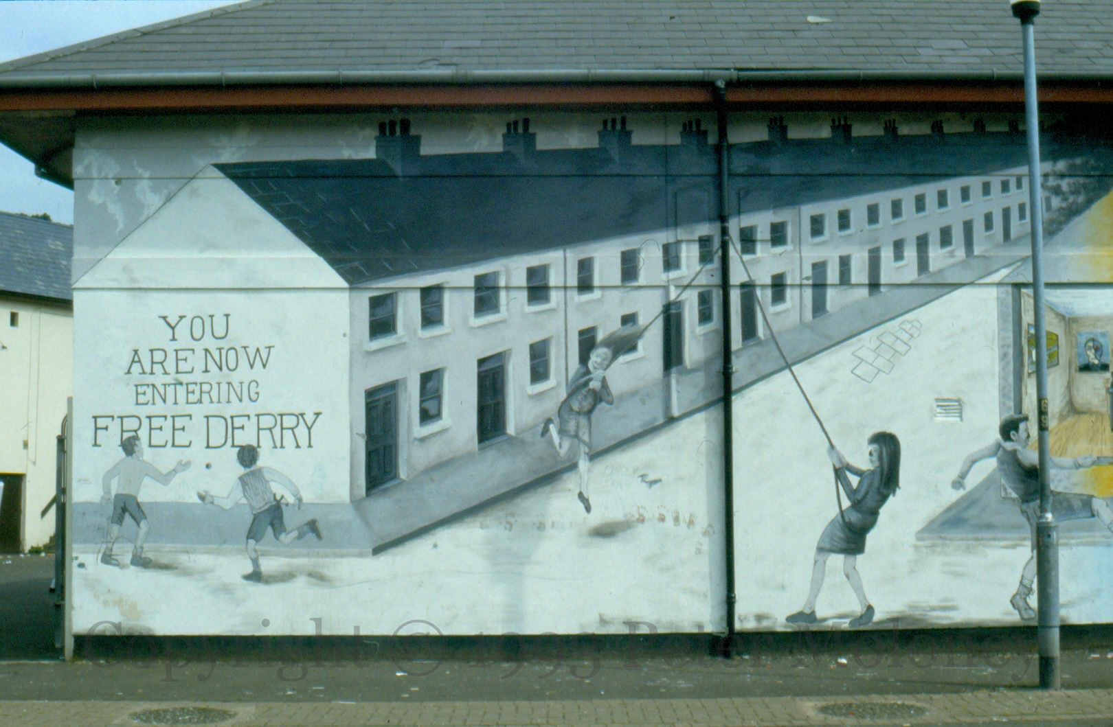 Lecky Road in the black-and-white of previous years, with children playing handball against the “Free Derry” wall and swinging from a lamp-pole, side-by-side with a colourful Lecky Road of the present, where they play soccer and sit at computers.