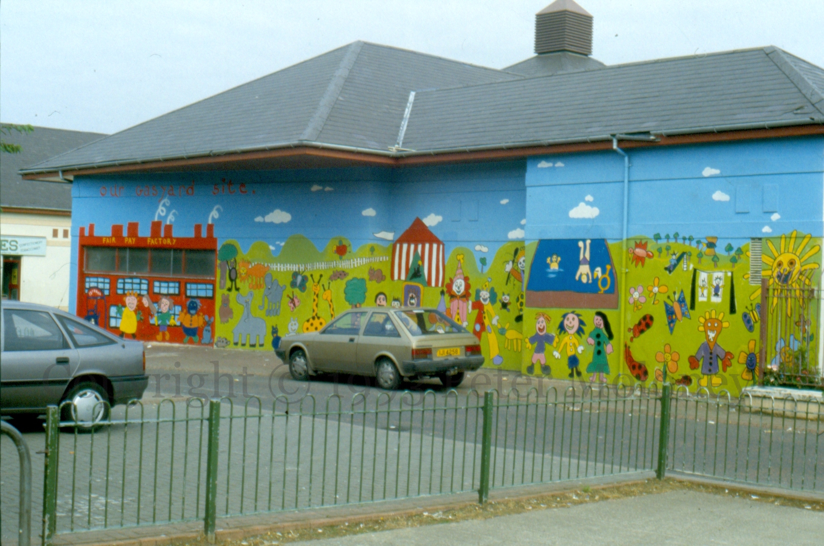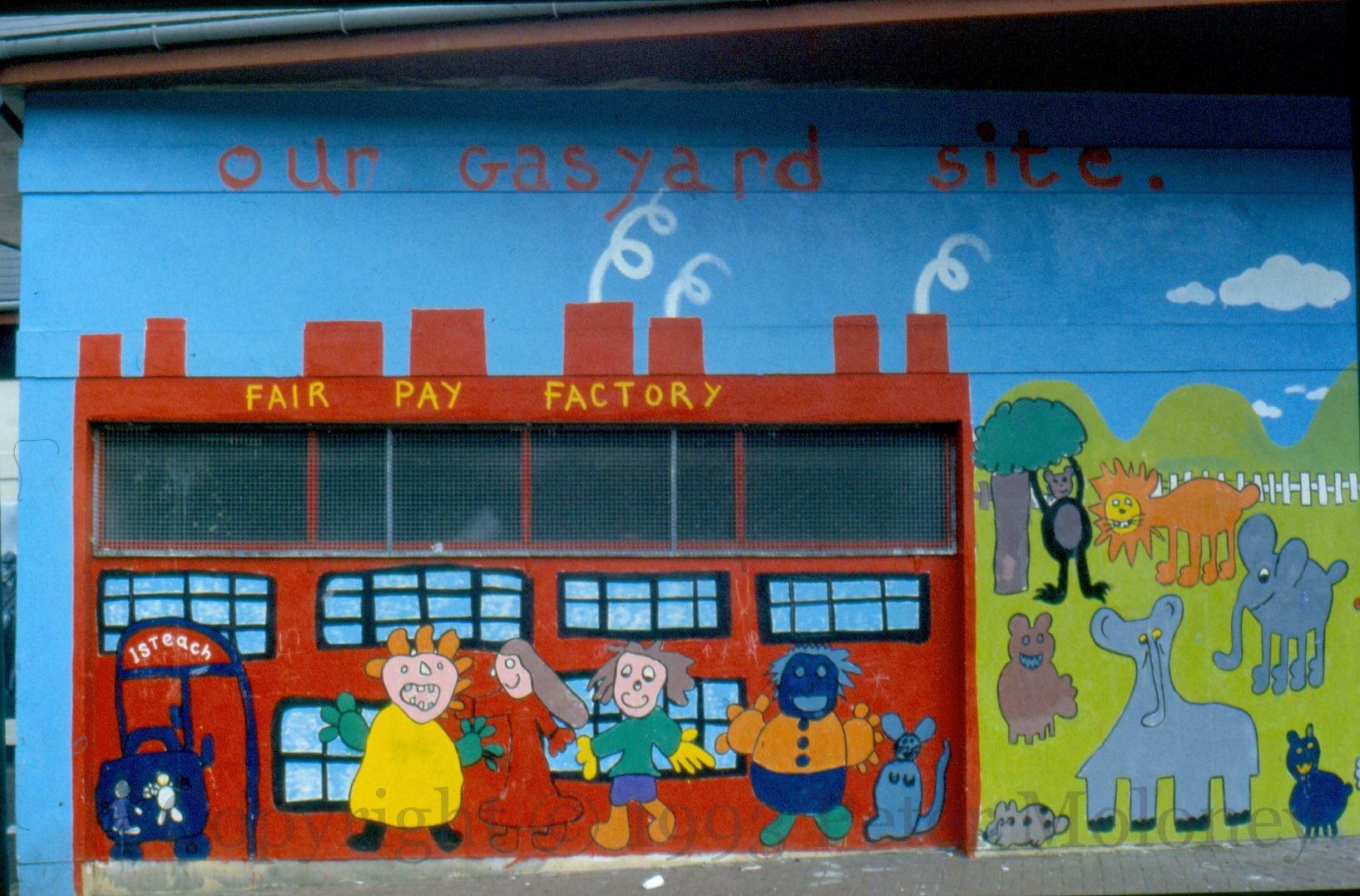 A kids mural with a message of economic justice: while the kids on the right play with the animals and go swimming, the adults work at “Fair Pay Factory” and enter through a door marked “Isteach”.