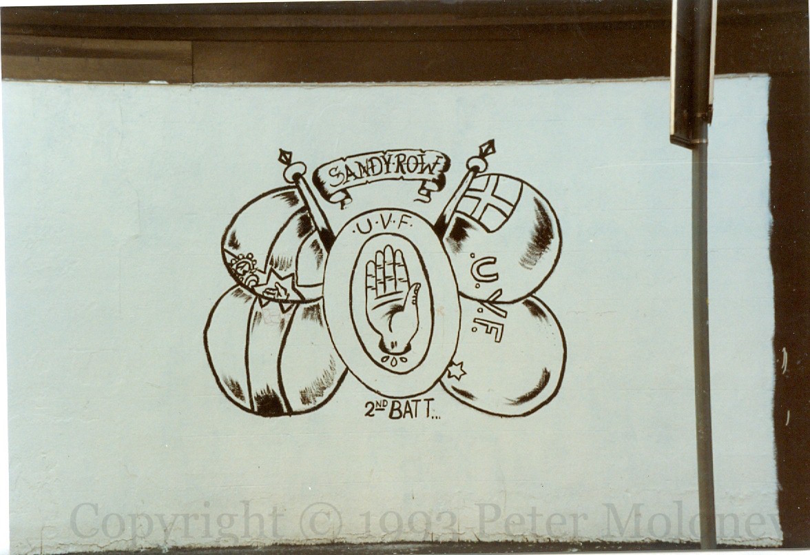 Sandy Row UVF 2nd Batt 1993-02-202025-02-19Extramural Activity An unusual line drawing mural, in cartoon style, of the UVF emblem (with blood dripping from the red hand) along with UVF flag and Ulster banner. Sandy Row, Belfast. Click image to enlargeCopyright © 1993 Peter MoloneyM02489 Share this: Share on X (Opens in new window) X Share on Facebook (Opens in new window) Facebook Like Loading... Related
