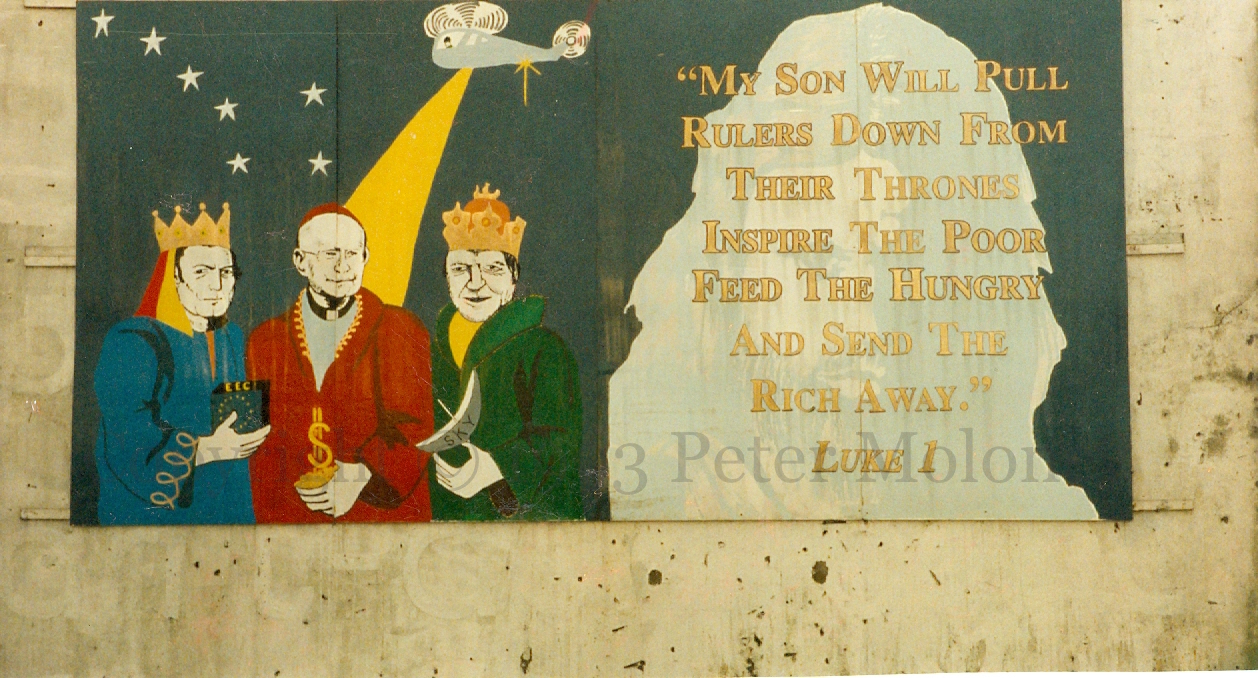 “My [republican prisoner] son will pull rulers down from their thrones, inspire the poor, feed the hungry, and send the rich away – Luke 1”. An army helicopter flying in a starry plough sky shines down its light on the three wise men of the European Economic Community (EEC), Catholic church, and Sky broadcasting.