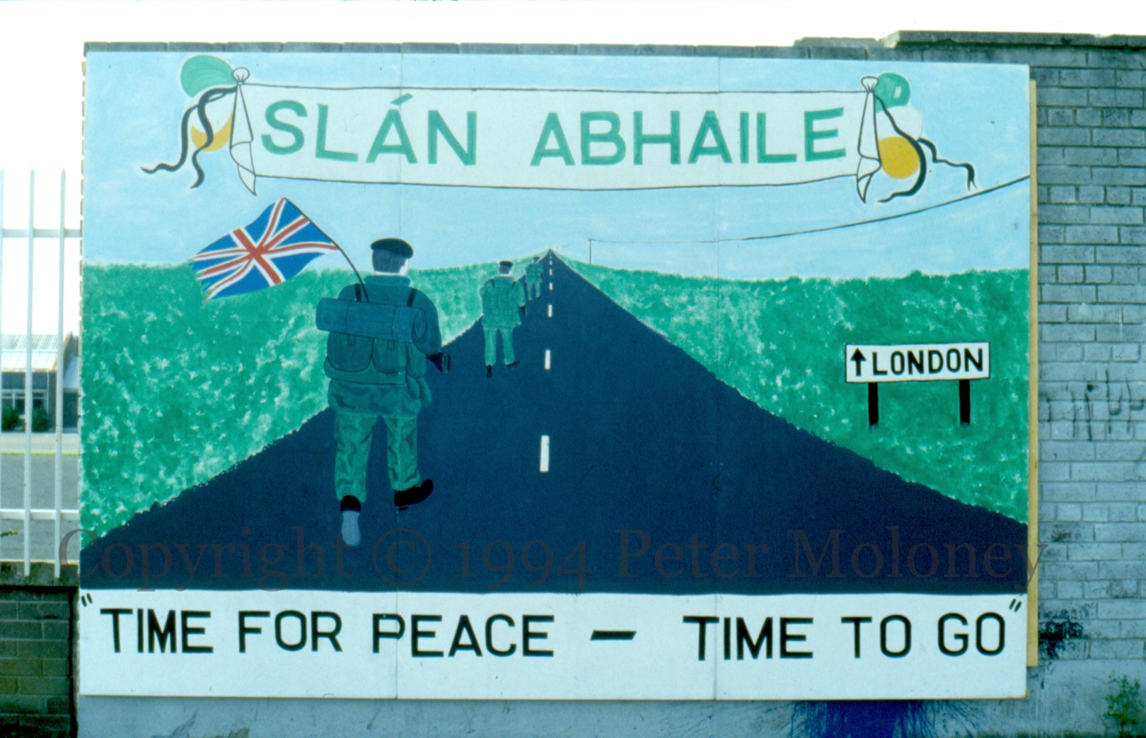 British army soldiers on the road to London under an Irish-language party banner with tricoloured balloons. “Time for peace – time to go.”