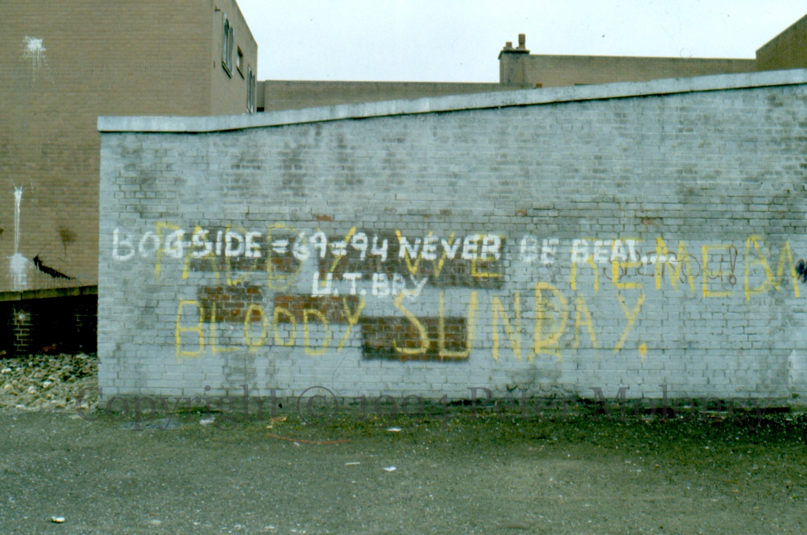 “Bogside = 69 = 94 Never be beat”, “U.T.BRY” (up the Bogside Republican Youth). For the graffiti underneath, see Paddy We Remember.