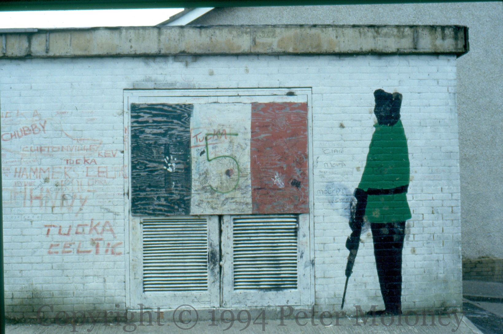Addressing The Flag 1994-01-212025-02-22Extramural Activity Republican volunteer with gun lowered in front of a Tricolour. Strabane Old Road, Gobnascale, Derry Click image to enlargeCopyright © 1994 Peter MoloneyM01108 Share this: Click to share on X (Opens in new window) X Click to share on Facebook (Opens in new window) Facebook Like Loading... Related
