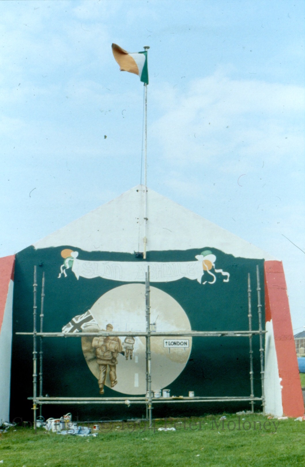Five images of a “Slán Abhaıle” mural, with British soldiers trooping back towards London, being painted on the back of Free Derry Corner, on Lecky Road, Derry. The piece is by Robert Ballagh, taking a famous photograph of British forces in the Falklands marching (“yomping”) towards Port Stanley and placing it in a circle (to suggest a closing eye, perhaps) below tricoloured party balloons. For the original photograph, see the IWM.