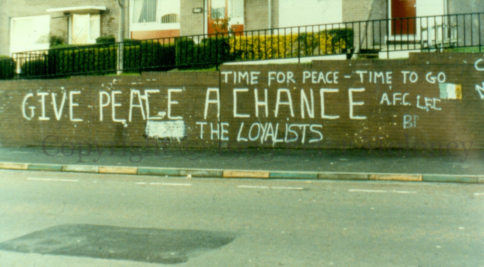 “Open all border roads now” and “Time for peace – time to go” graffiti join “Give peace a chance” in Bishop Street, Derry.
