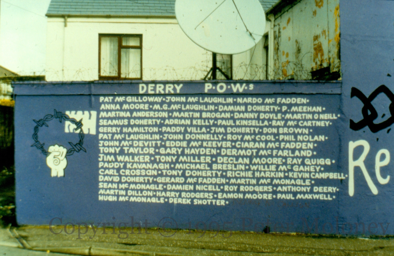 An expanded (in 1995) list of Derry POWs on the side-wall of 700 Irish Political Hostages. Two lines have been added above the original and eight below.