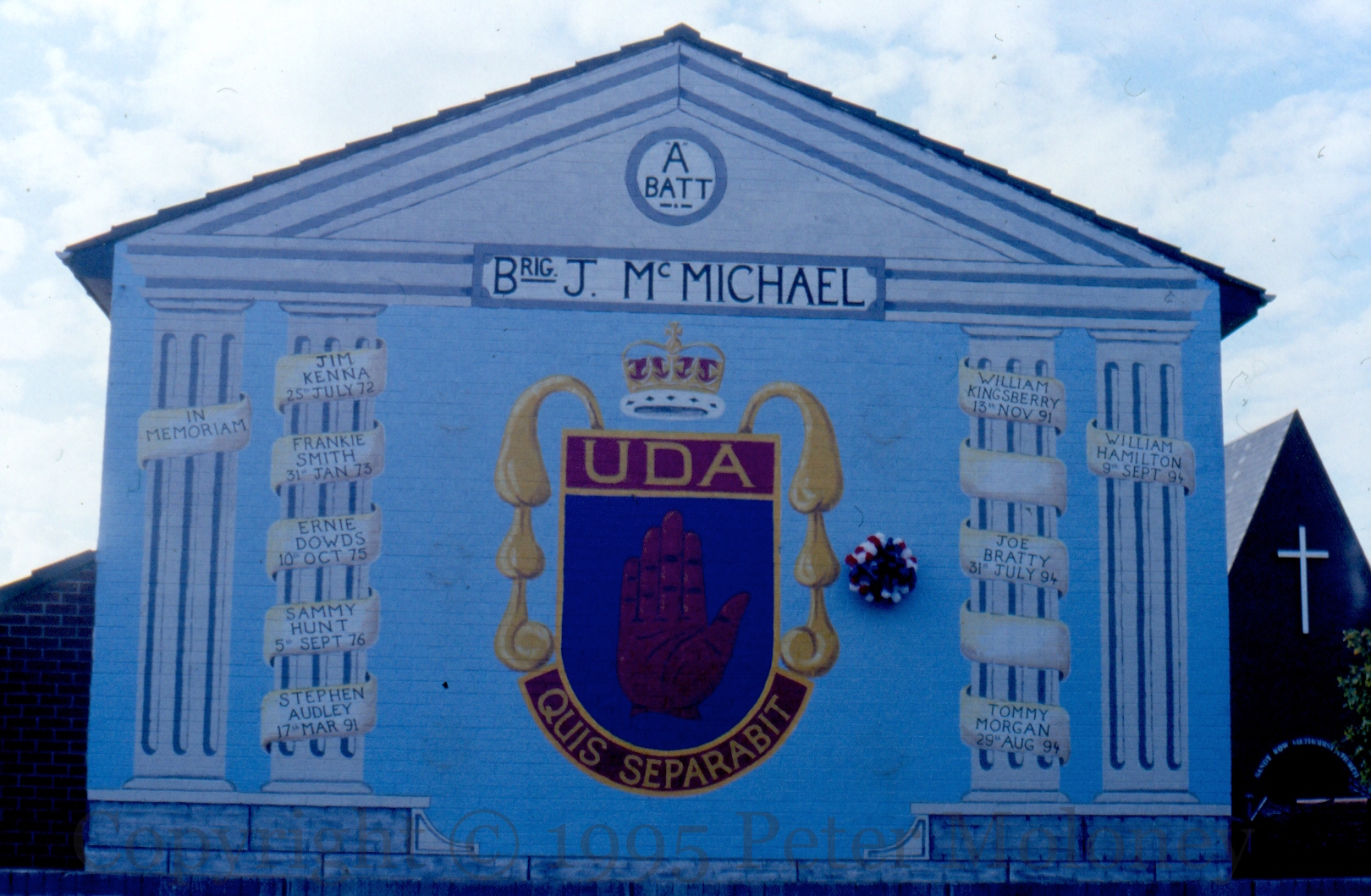 This is a UDA roll of honour mural to John McMichael and other “A battalion” south Belfast UDA volunteers.
