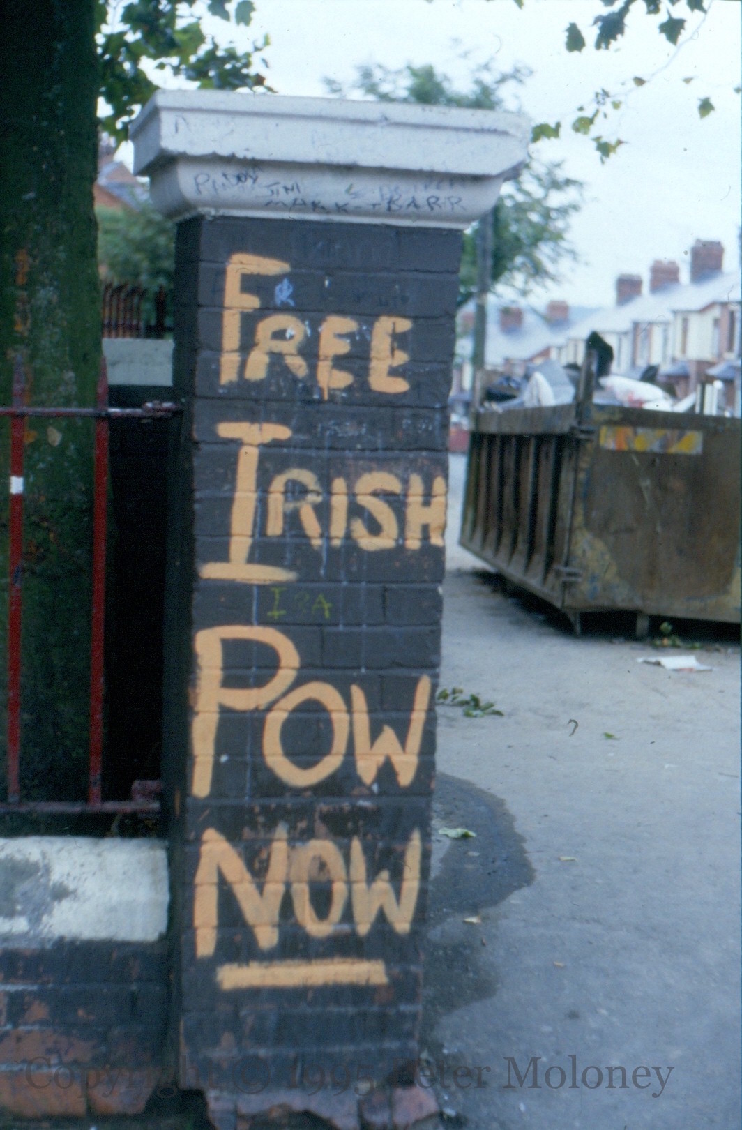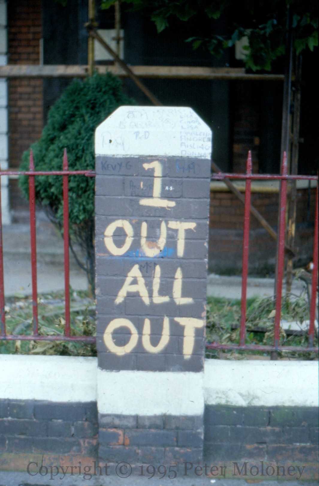 Two pieces of republican graffiti from the Falls Road, Belfast: “1 out, all out” and “Free Irish POW now”. The “1” is paratrooper Lee Clegg, who was freed on July 3rd, 1995, after four years of a life sentence for killing a joyrider on the Glen Road.