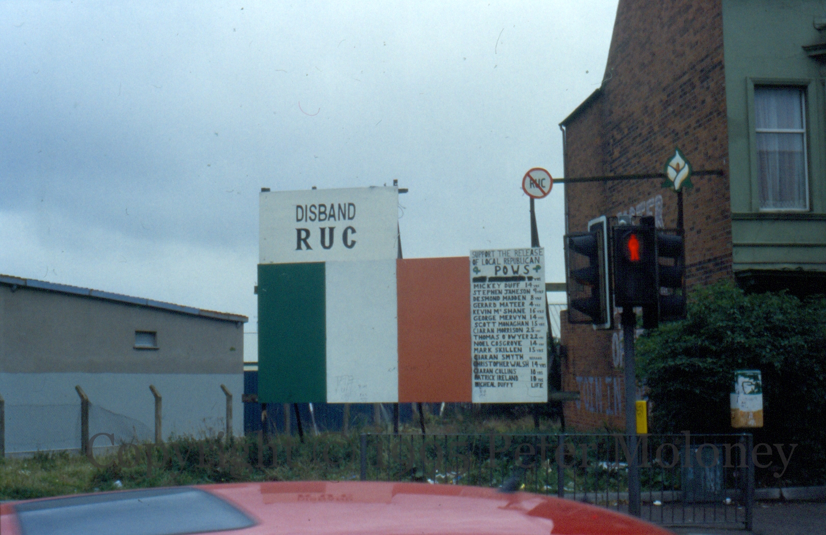“Disband RUC” and a small “No RUC” road sign and Easter lily, above a large Tricolour and a “green ribbon” list of “Local Republican POWs”: Mickey Duff, Stephen Jameson, Desmond Madden, Gerard, Mateer, Kevin McShane, George Mervyn, Scott Monaghan, Ciaran Morrison, Thomas O’Dwyer, Noel Cosgrove, Mark Skillen, Ciaran SMyth, Christopher Walsh, Ciaran Collins, Patrick Ireland, Michaal Duffy.