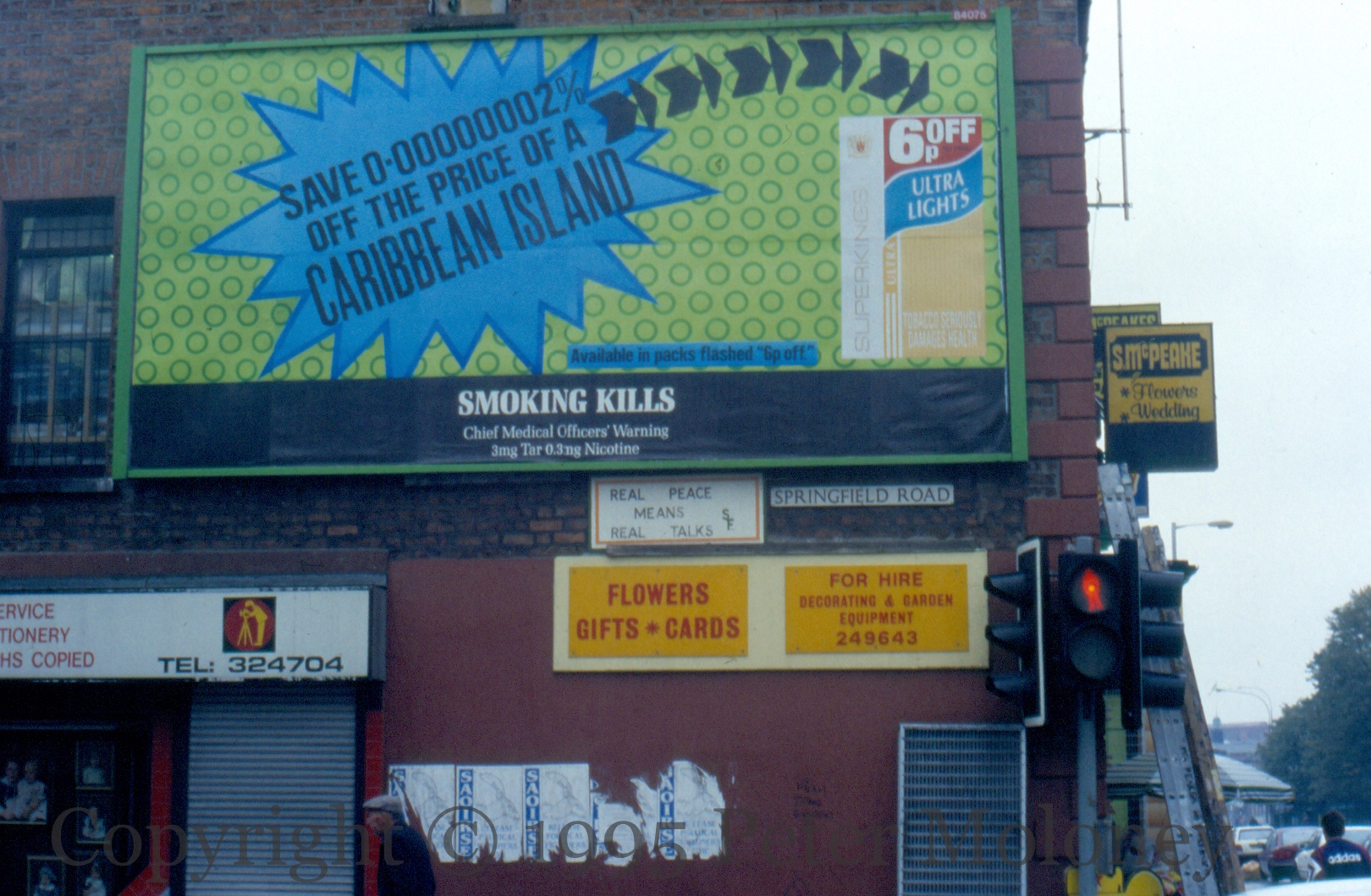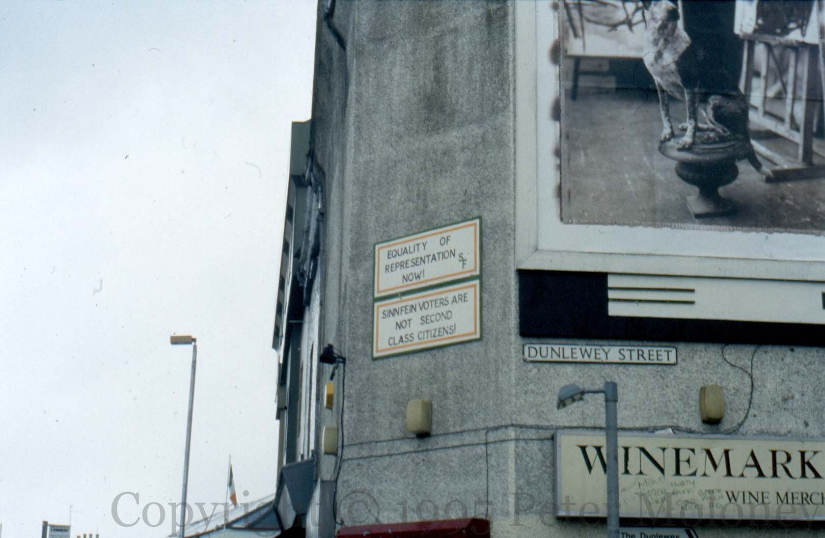 Sınn Féın Voters Are Not Second Class Citizens 1995-02-132025-02-22Extramural Activity Two images of Sınn Féın boards in the same style. Above, “Equality of representation now” and “Sınn Féın voters are not second class citizens”; below, “Real peace means real talks”. Click image to enlargeCopyright © 1995 Peter MoloneyM01230 M01221 Share this: Click to share on X (Opens in new window) X Click to share on Facebook (Opens in new window) Facebook Like Loading... Related