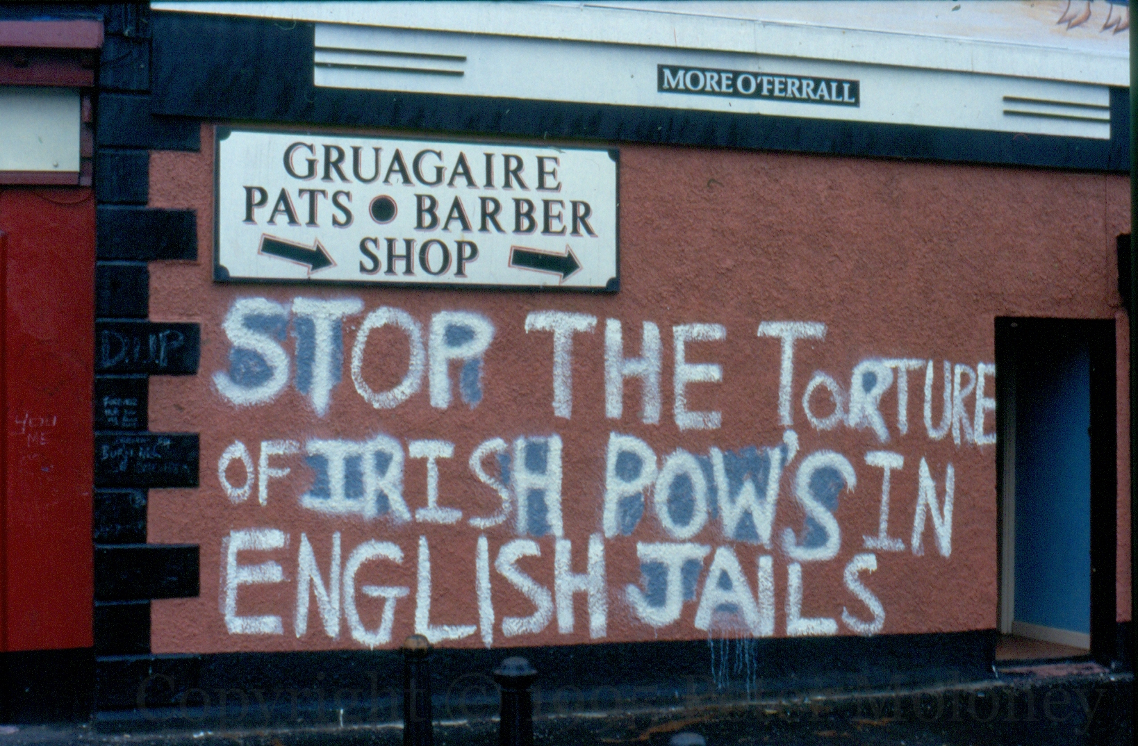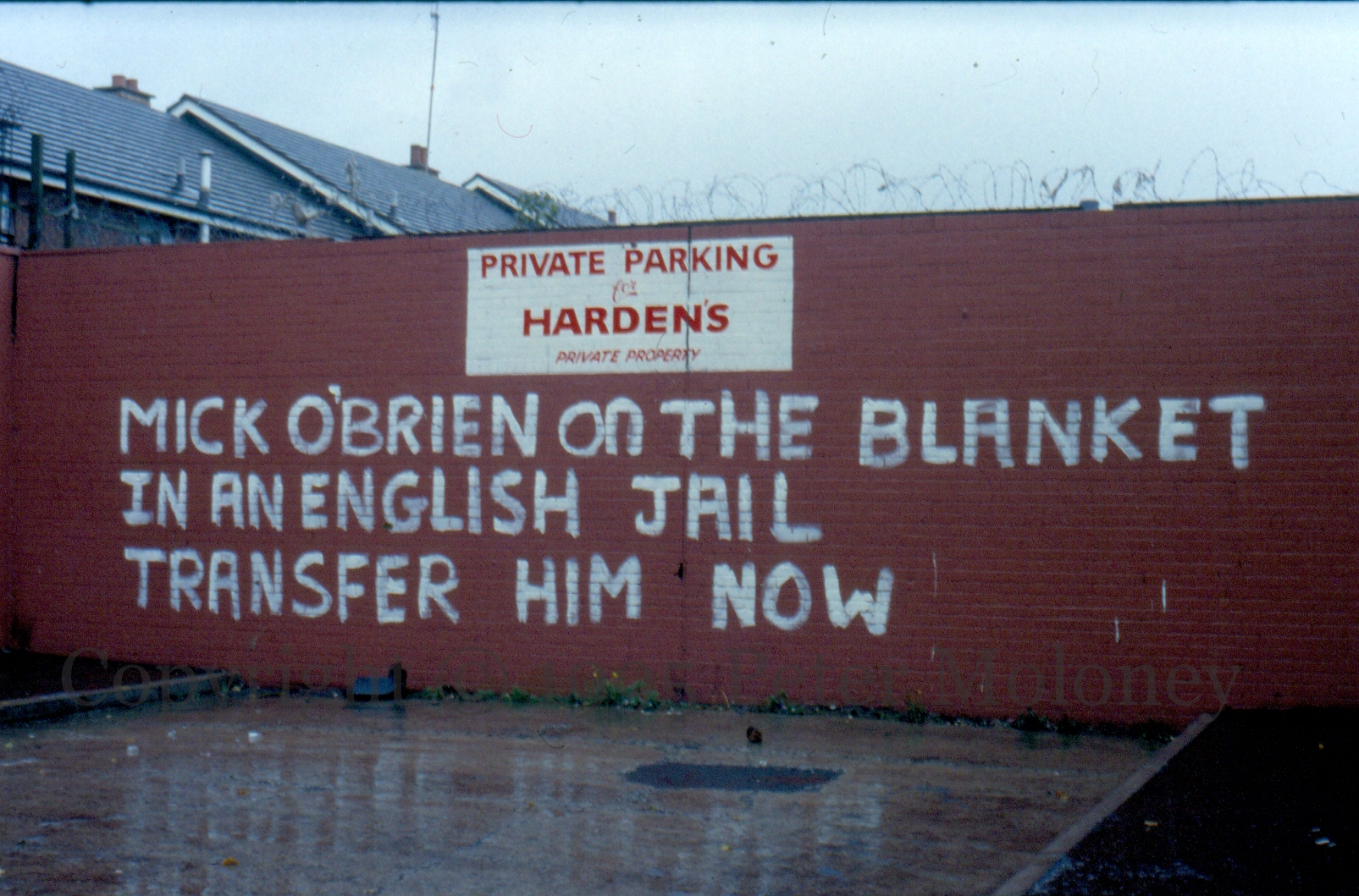 More graffiti urging the transfer of republican prisoners from English jails. Mick O’Brien was jailed for his part in the killing of North Yorkshire Constable Glen Goodman in 1992. He was moved to Portlaoise and released in 1998. (An Phoblacht interview | Irish Times). “Mick O’Brien on the blanket in an English jail – transfer him now”, “Stop the torture of Irish POWs in English jails.”
