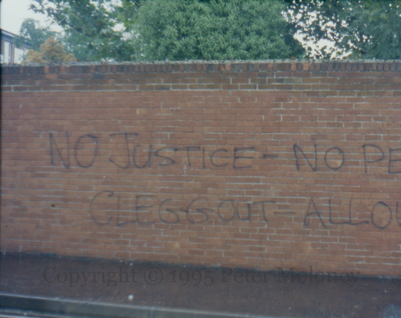 No Justice – No Peace 1995-02-182025-02-22Extramural Activity “No justice – no peace” and “Clegg out – all out”. An image from the end of the camera-roll. Somewhere on the Falls Road. Click image to enlargeCopyright © 1995 Peter MoloneyM01228 Share this: Click to share on X (Opens in new window) X Click to share on Facebook (Opens in new window) Facebook Like Loading... Related