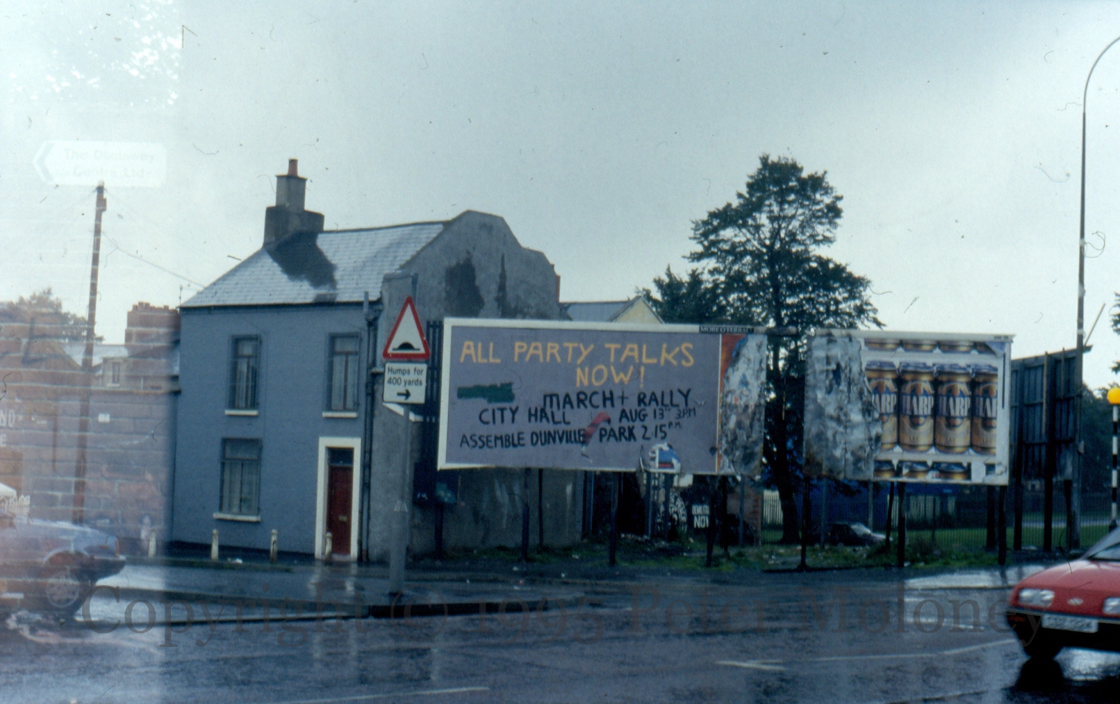All Party Talks Now! 1995-02-192025-02-22Extramural Activity Hand-made call to a march, on a billboard on the Falls Road, Belfast: “All party talks now! March + rally [to] City Hall, Aug. 13th 3 pm. Assemble Dunville Park 2:15 pm.” Click image to enlargeCopyright © 1995 Peter MoloneyM01229 Share this: Click to share on X (Opens in new window) X Click to share on Facebook (Opens in new window) Facebook Like Loading... Related