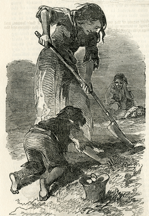 Four people in rags search for potatoes in a field, with abandoned houses in the background. A mural commemorating the Great Hunger, based on images from the reports of London Illustrated (including the one below), on the New Lodge Road.