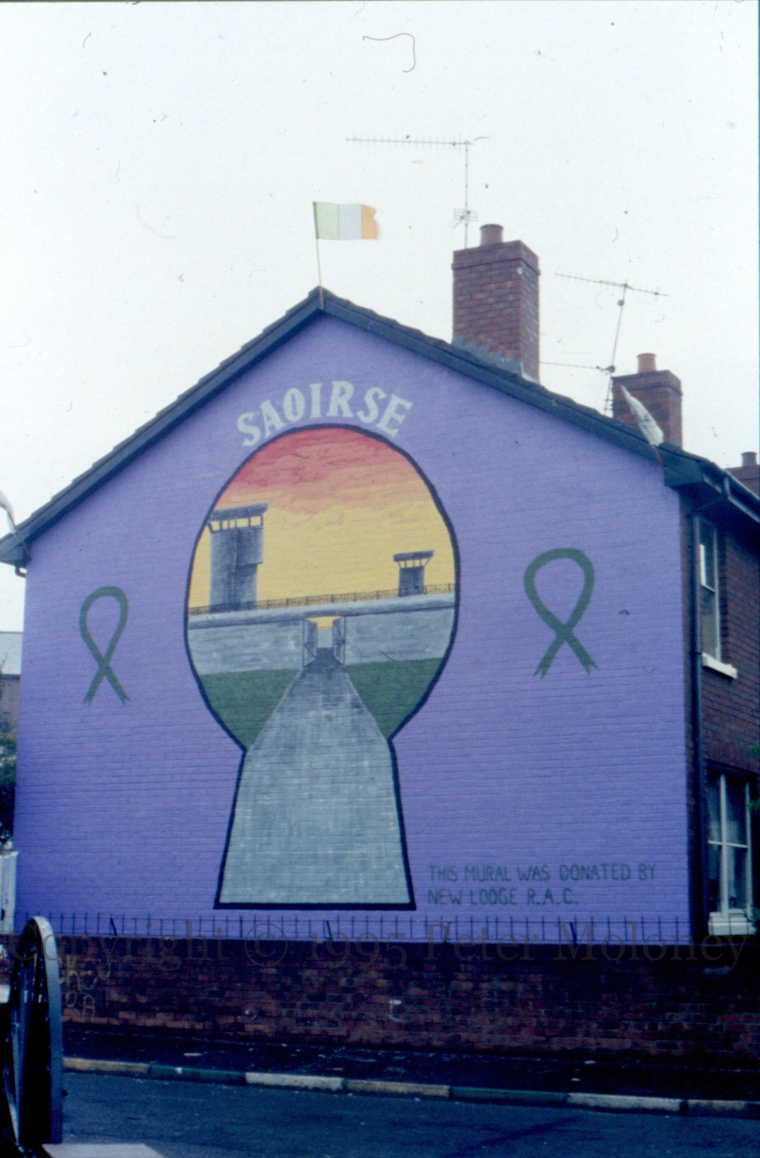 Long Kesh viewed through a keyhole, with green ribbons from the campaign to free republican prisoners. “The mural was donated by New Lodge RAC [Relatives Action Committee]”.