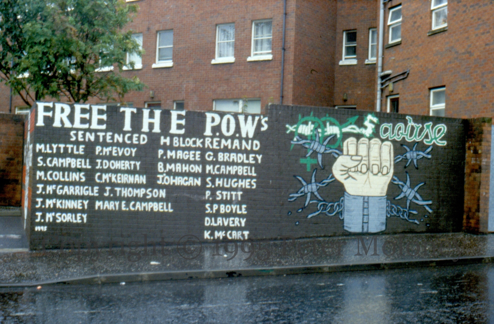 On the right, a manacled fist in front of strands of barbed wire, with “saoırse” and the male and female symbols in the green of the ‘green ribbon’ campaign. New Lodge Road, Belfast. Also rare: the mural is dated (1995).