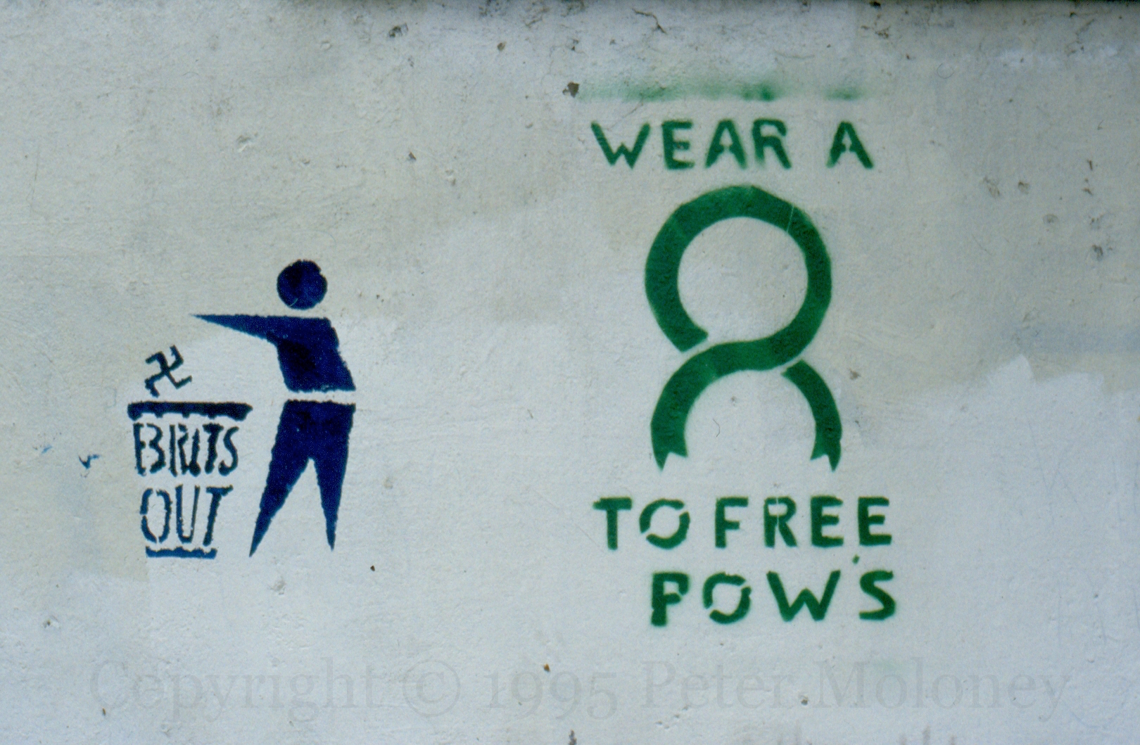 Brits Out 1995-03-142025-02-22Extramural Activity A swastika is thrown into a “Brits out” bin. Next to “Wear a [green ribbon] to free POWs”. Lecky Road, Derry Click image to enlargeCopyright © 1995 Peter MoloneyM01258 Share this: Share on X (Opens in new window) X Share on Facebook (Opens in new window) Facebook Like Loading... Related