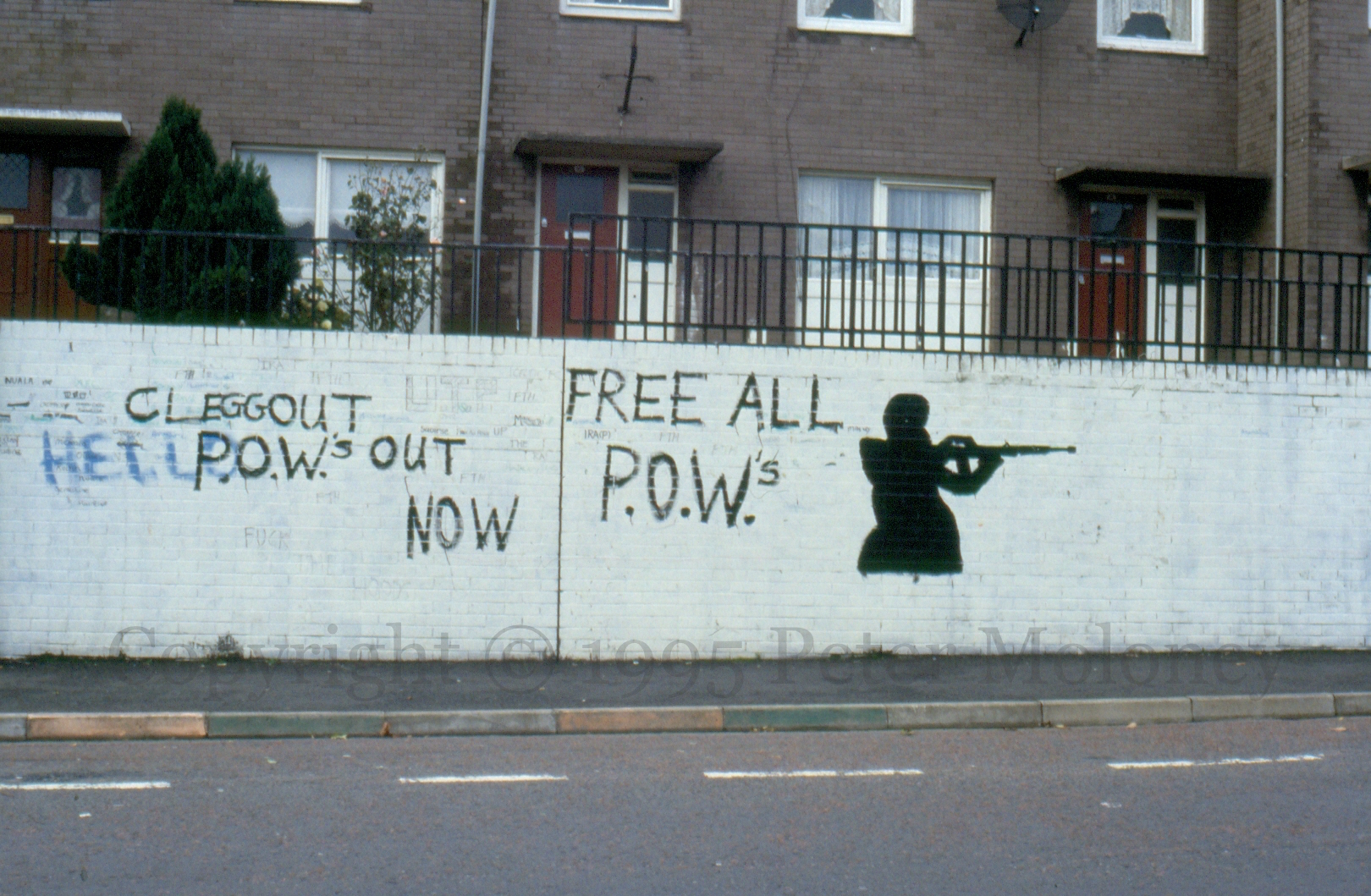 POWs Out Now 1995-03-152025-02-22Extramural Activity “Clegg out, POWs out now” and “Free all POWs” over what was previously a string of panels in Bishop Street, Derry (1982 | 1986). Click image to enlargeCopyright © 1995 Peter MoloneyM01259 Share this: Share on X (Opens in new window) X Share on Facebook (Opens in new window) Facebook Like Loading... Related