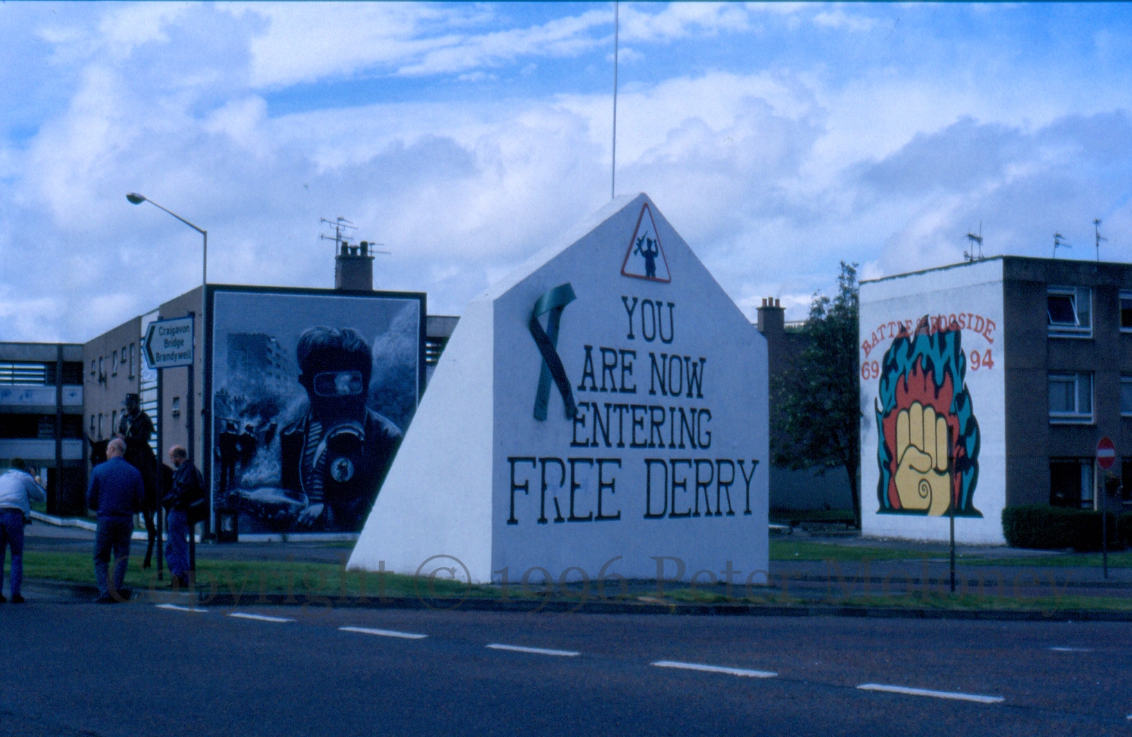 Free Derry Corner with both a green ribbon for the release of POWs, and a celebrating volunteer on a red triangle (warning) road sign. Visible in the wide shot are The Petrol Bomber and Battle of the Bogside.