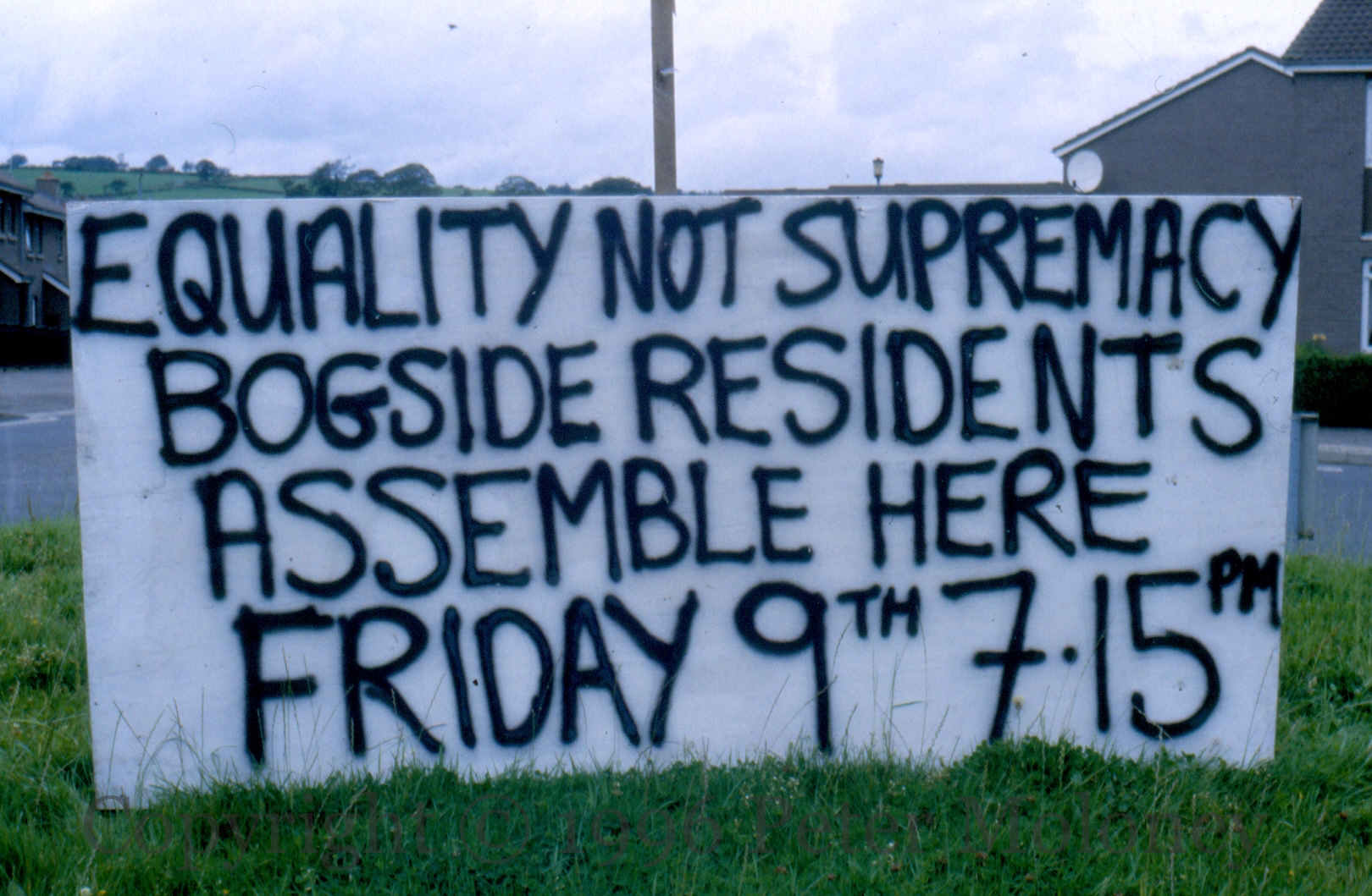 Equality Not Supremacy 1996-01-092025-02-22Extramural Activity A march about marches: “Equality not supremacy. Bogside residents assemble here [February?] Friday 9th [1996?] 7.15 pm” Creggan Road, Derry Click image to enlargeCopyright © 1996 Peter MoloneyM01275 Share this: Share on X (Opens in new window) X Share on Facebook (Opens in new window) Facebook Like Loading... Related