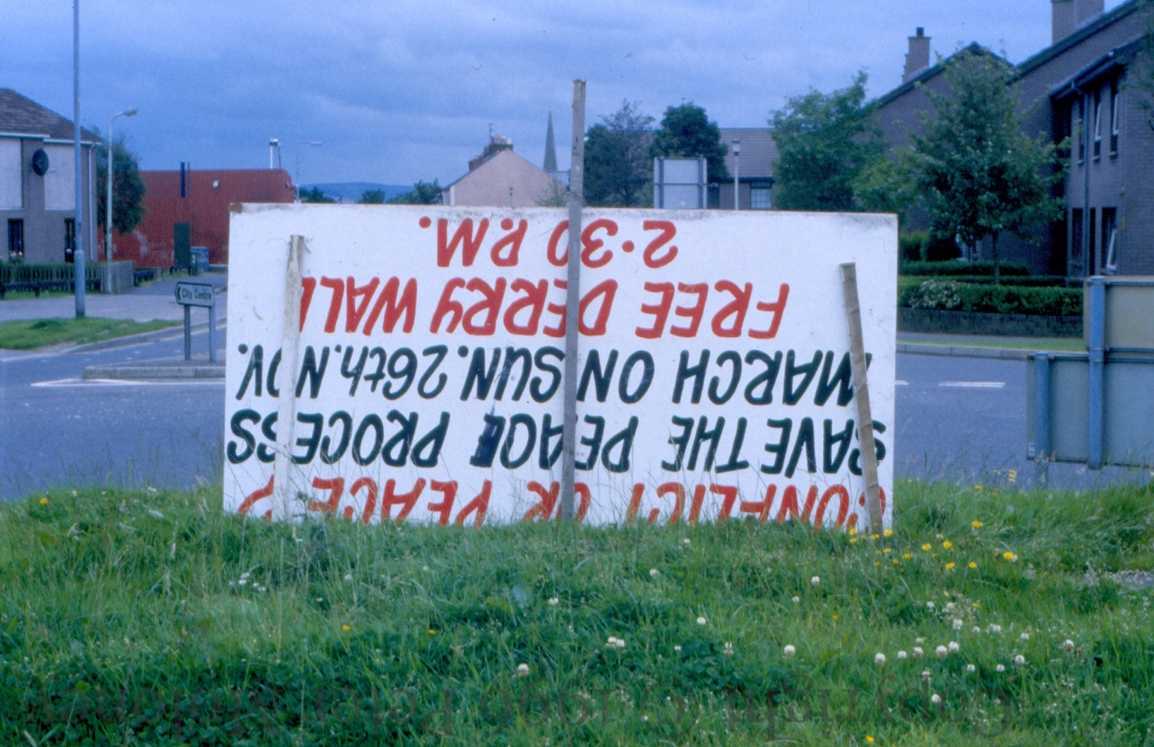 Conflict Or Peace? 1996-01-102025-02-22Extramural Activity Upside-down board calling for a march to “save the peace process”, left over from Sunday 26th November, 1995. Creggan Road, Derry Click image to enlargeCopyright © 1996 Peter MoloneyM01276 Share this: Share on X (Opens in new window) X Share on Facebook (Opens in new window) Facebook Like Loading... Related