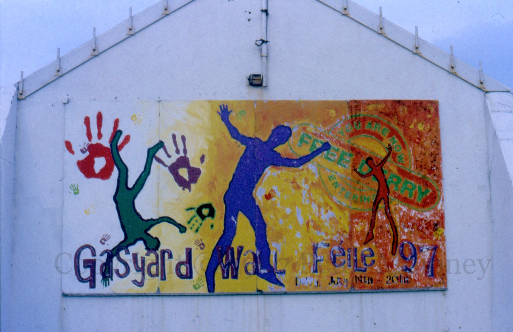 Gasyard Wall Féıle 97 1997-01-042025-02-23Extramural Activity Break-dancing at the Derry festival, July 14th-20th 1997, with “You are now entering Free Derry” in the style of a subway-station sign. Lecky Road, Derry. Click image to enlargeCopyright © 1997 Peter MoloneyM01305 Share this: Click to share on X (Opens in new window) X Click to share on Facebook (Opens in new window) Facebook Like Loading... Related