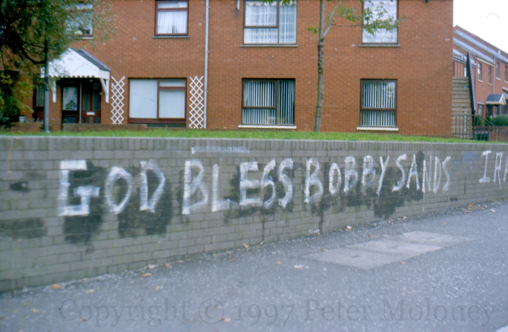 God Bless Bobby Sands 1997-01-052025-02-23Extramural Activity “God bless Bobby Sands” and “IRA” graffiti on a low wall in Bishop Street, Derry. Click image to enlargeCopyright © 1997 Peter MoloneyM01310 Share this: Click to share on X (Opens in new window) X Click to share on Facebook (Opens in new window) Facebook Like Loading... Related