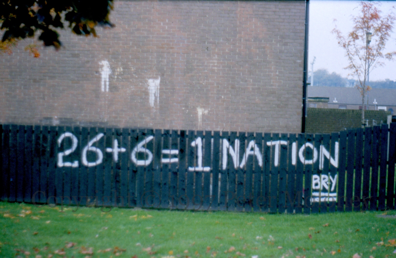 26 + 6 = 1 Nation 1997-01-082025-02-23Extramural Activity BRY [Bogside Republican Youth] graffiti in Letterkenny Road, Derry. Click image to enlargeCopyright © 1997 Peter MoloneyM01311 Share this: Click to share on X (Opens in new window) X Click to share on Facebook (Opens in new window) Facebook Like Loading... Related