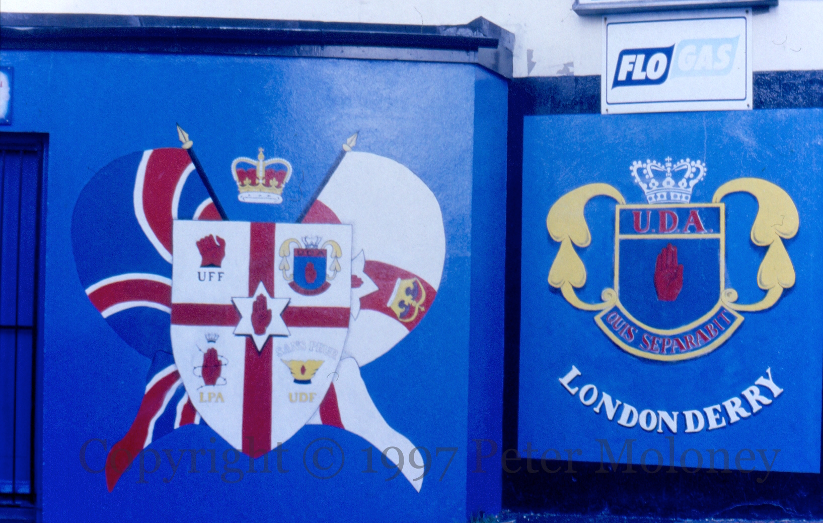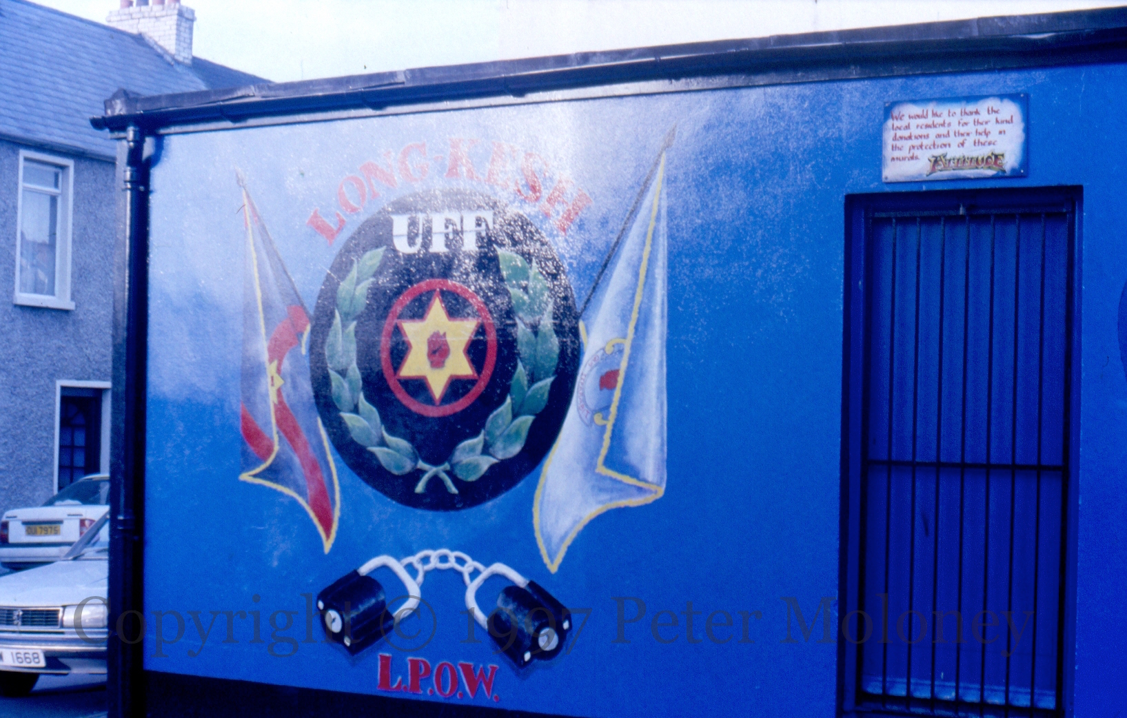 Chained-together padlocks represent Long Kesh and UDA/UFF prisoners of war (LPOW). For the four-quadrant shield, see Sans Peur.