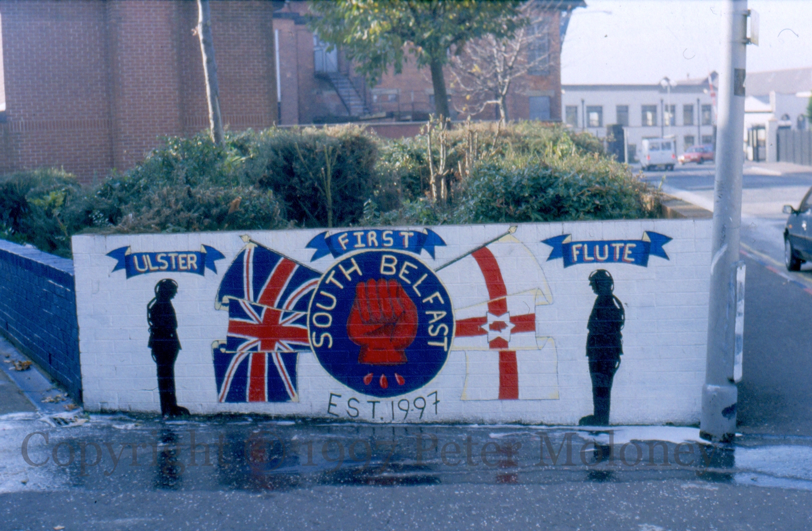 Ulster First Flute (Fb) mural in Linfield Gardens, Belfast. Blood drips from a red fist between solemn volunteers and the flags of Britain and Northern Ireland.