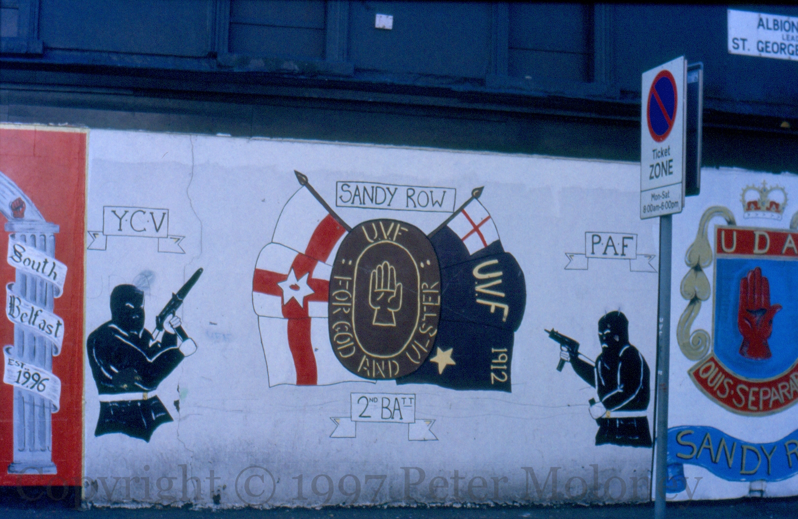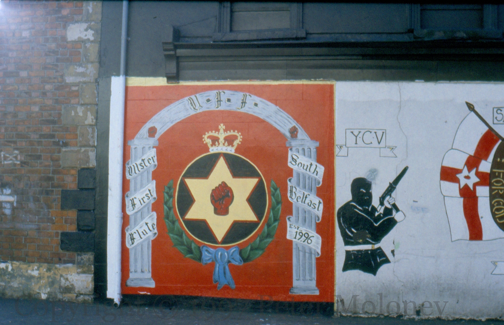 Three panels in a row with Ulster First FLute, UVF/PAF/YCV, and UDA insignia. In the middle, on either side of the UVF’s “for God and Ulster”, masked volunteers carry Uzis.