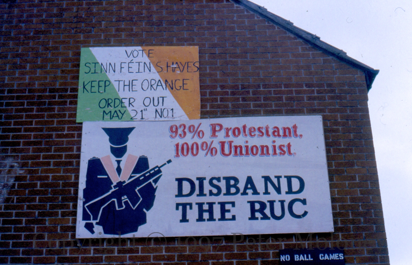Two boards in Welsh Street, south Belfast: “Vote Sınn Féın’s [Seán] Hayes. Keep the Orange Order out. May 21st No. 1” and “93% Protestant, 100% Unionist – Disband the RUC.” The figure on the left is a three-in-one RUC officer, Orange Order member, and loyalist paramilitary. Hayes was elected fourth from the Laganbank district, taking a seat from the SDLP.