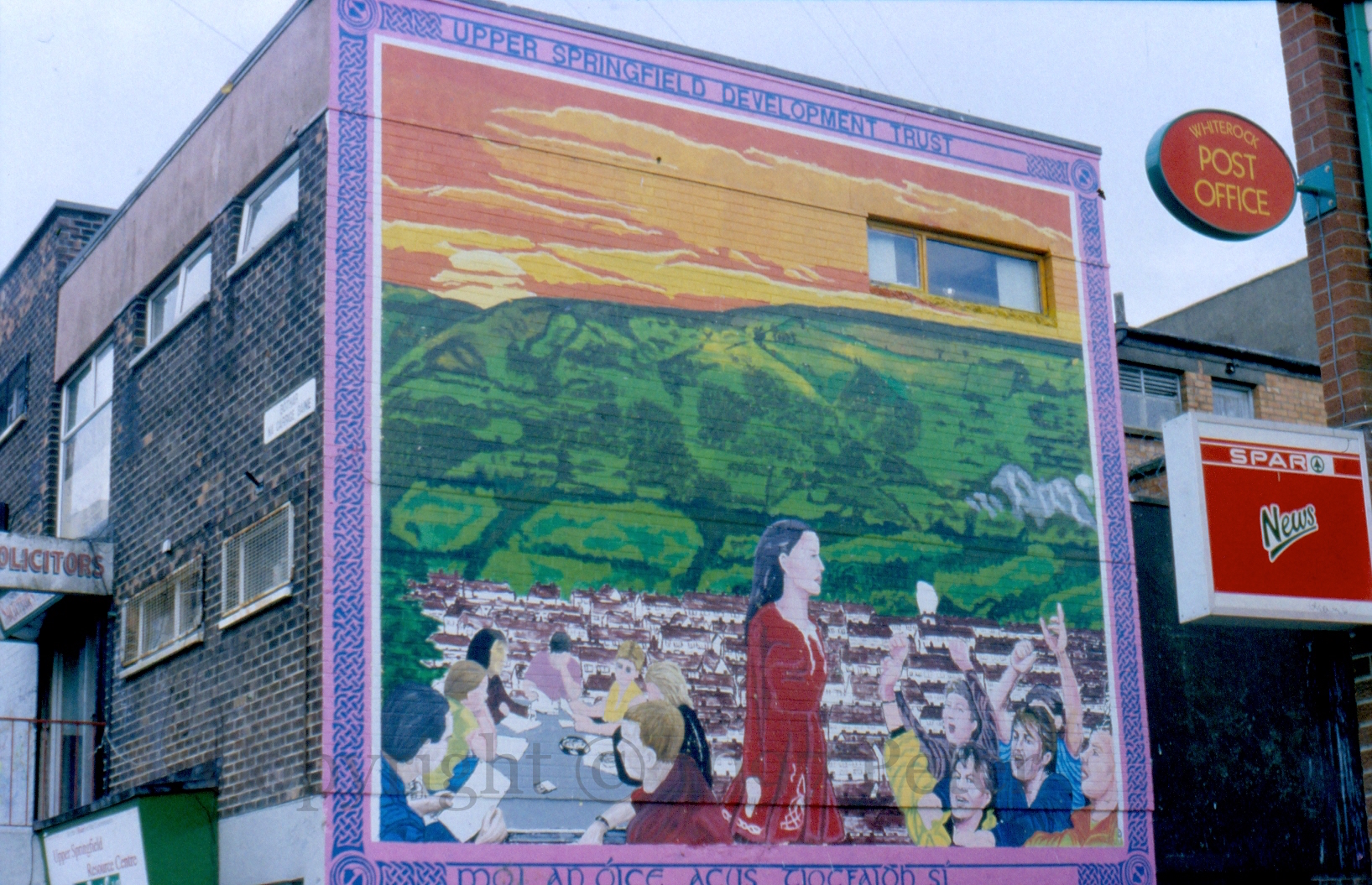 This is a mural sponsored by and for the Upper Springfield Development Trust (web | until 1993 the Upper Springfield Development Forum) focusing on young people: “Mol an óıge agus tıocfaıdh sí.” (Praise youth/the young and it will flourish.”/”Youth responds to praise.”)