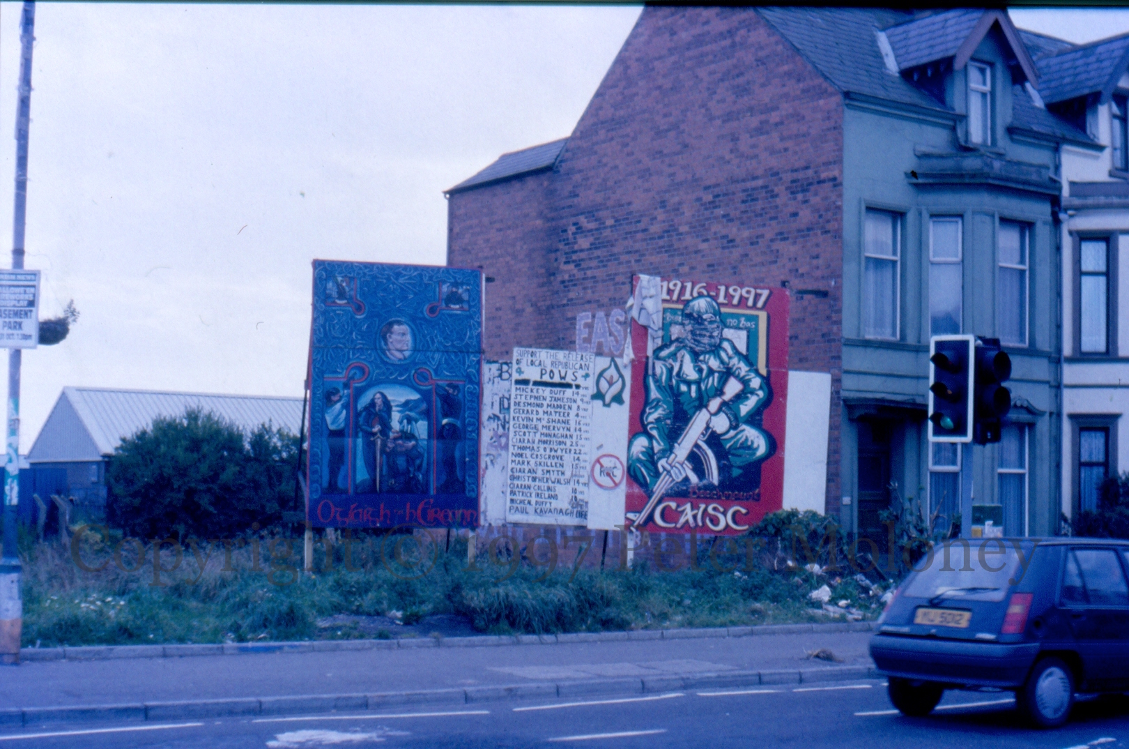 Three boards on the Falls Road, Belfast. The first pays homage to Óglaigh na hÉireann (IRA) by mixing ornate knotwork and Celtic imagery of a dolmen and warrior with sword with a volley of pistol and rifle; the second is a list of “local republican POWs”, almost identical to the list in Beechmount POWs (for a list of names see, 1995 Disband RUC); the third links the revolutionaries of 1916 with the armed struggle “1916-1997”.