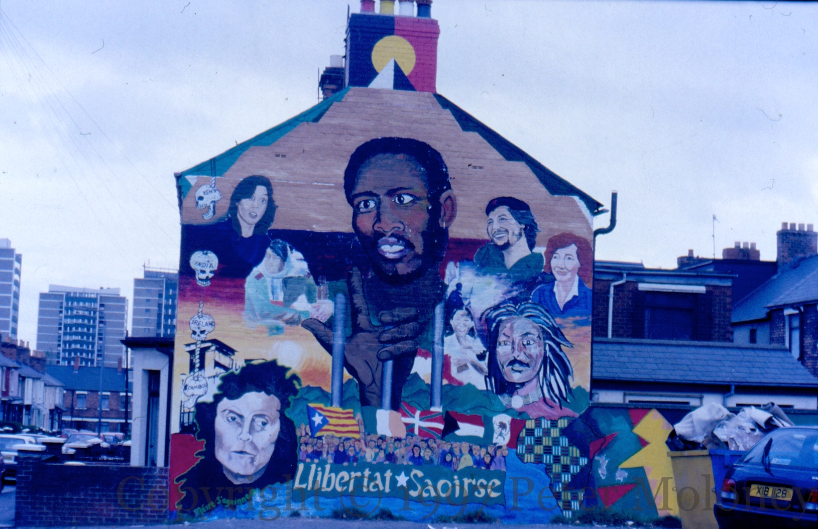 Mural of international solidarity between Catalonia (llibertat), Ireland (saoırse), the Basque country, Palestine, and Mexico. Skulls from Kenya, India, Ireland, Cambodia hang on the left. Painted by Féıle Artists along with Victor Ochoa (WP), featuring Steve Biko, Che, Máıre Drumm, Maıréad Farrell, Miram Daly (whose son Donal worked on this mural), Nelson Mandela, Leila Khaled, and Leonard Peltier. The aboriginal flag is on the chimney breast and the pots are painted in the four colours of man.