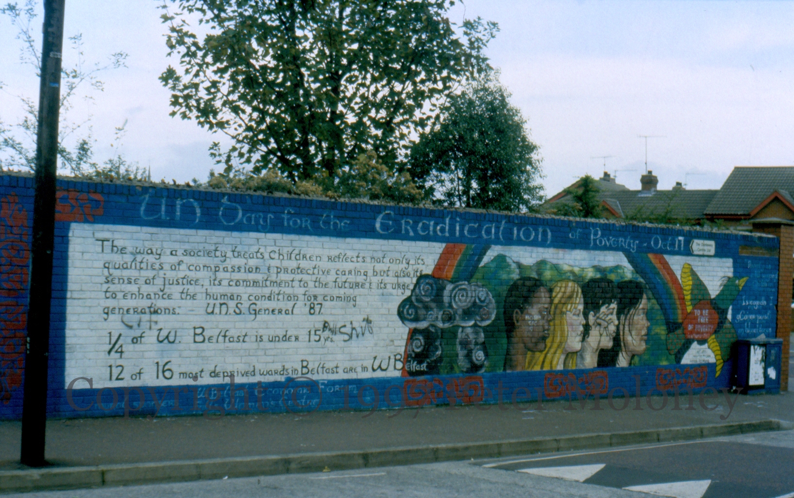 October 17th, each year, is the United Nations’ International Day for the Eradication of Poverty. The mural shown above states that “12 of the 16 most deprived wards in Belfast are in W. Belfast”. Mural by Andrea Redmond and Margaret McCann in Dunlewey Street, Belfast, sponsored by W. Belfast Economic Forum and the Falls Women’s Centre, showing children of the world under a rainbow and between a dolmen and a ?parrot?. For close-ups see this 2015 post on Extramural Activity.