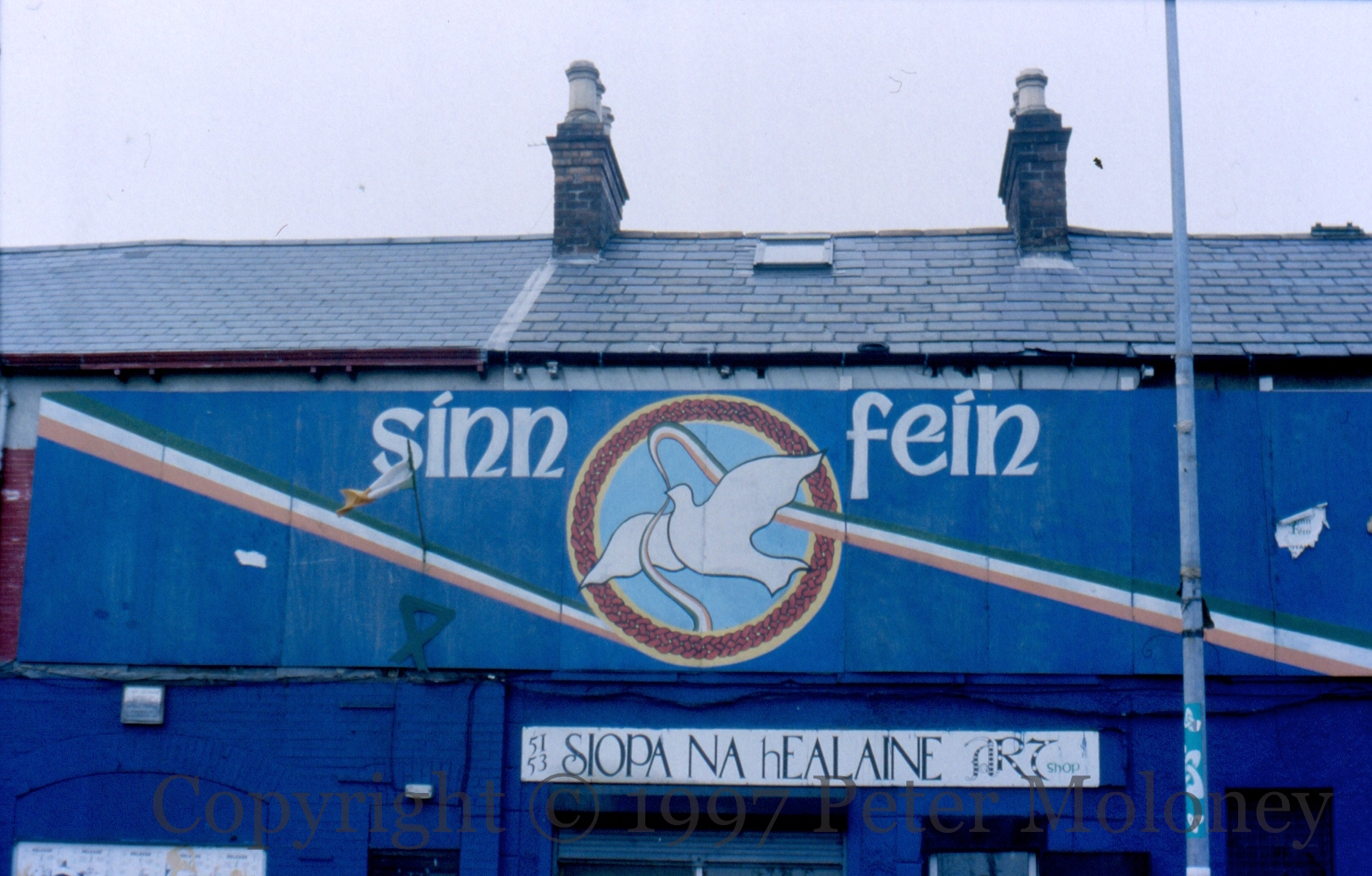 Two images from the Sinn Fein [sic – Sınn Féın] office on the Falls Road, Belfast. A dove (inside a braided circle) carries a tricoloured ribbon. To the right is a list of prisoners, seen previously in 1995’s Sınn Féın Peace Action Monitor.