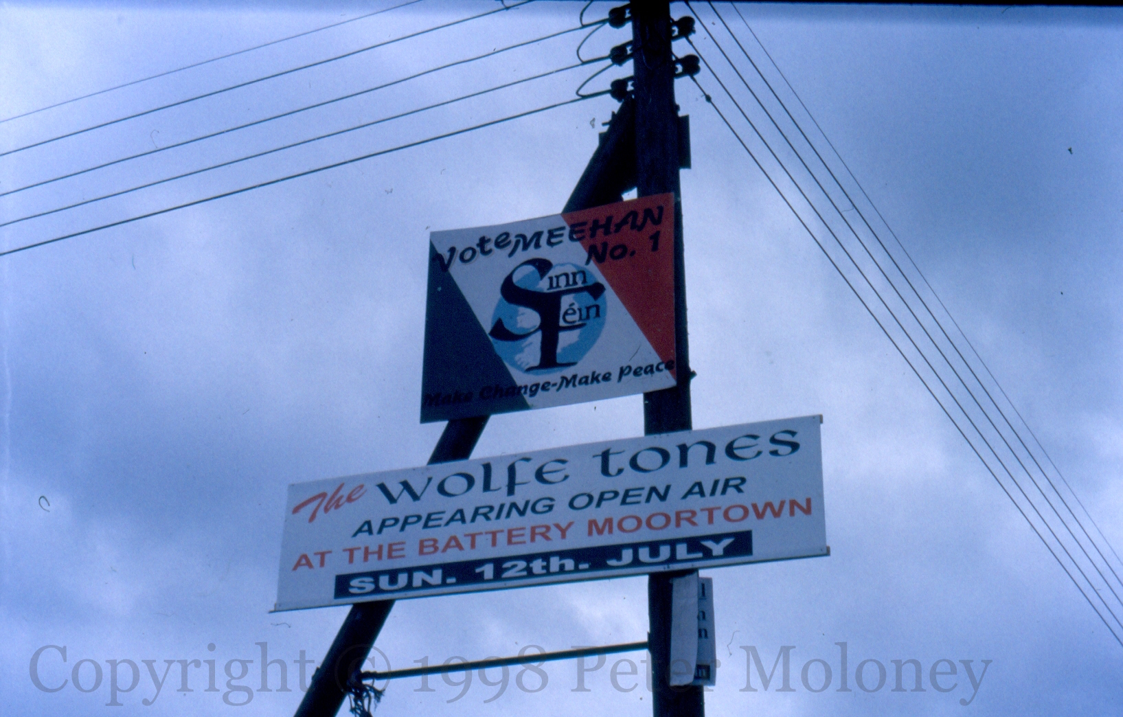 Two lightpole boards on Moneynick Road, Toome: “Vote Meehan No. 1” and a prisoner behind bars. Also, an ad for The Wolfe Tones “appearing open air at the Battery Moortown, Sun 12th July.”